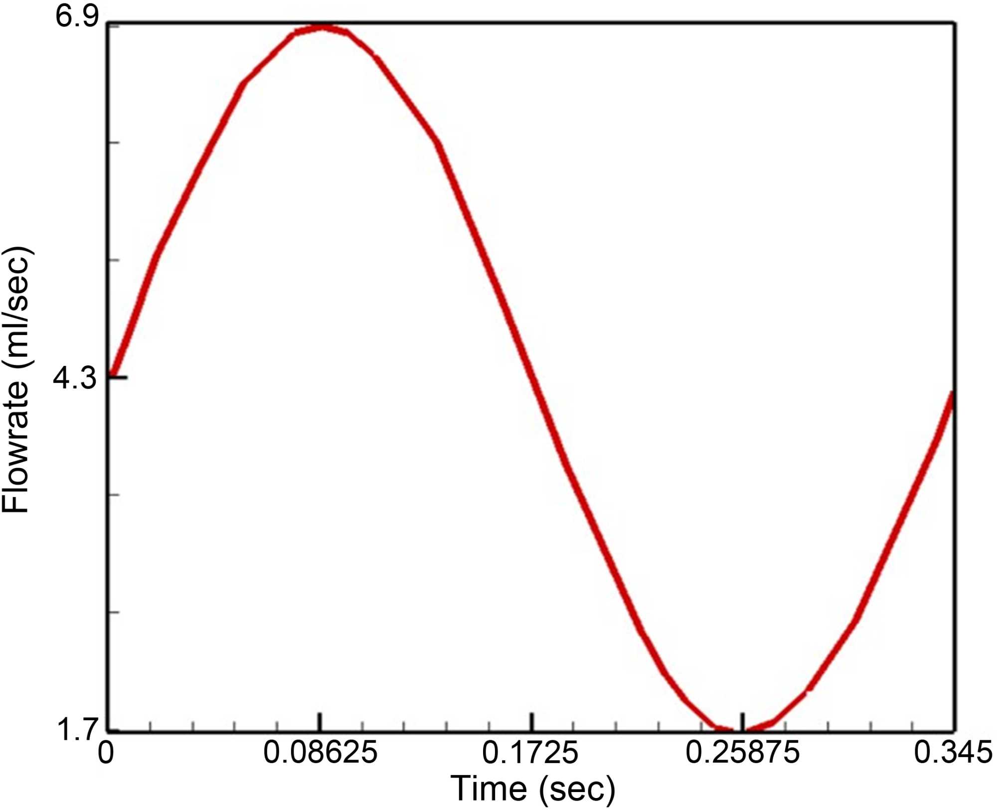 inlet flowrate pulse for the present computational fluid model [28]. A no-slip boundary condition is applied at the wall, while the outlet pressure remains static. The pulsatile flow exhibits a waveform of 4.3 ± 2.6 ml with a duration of 0.345 s, produced by a frequency of 2.9 Hz. The fluid has a density of 755 kg/m3 and a viscosity of 0.00143 N∙s/m2. The inlet pulse is a sinusoidal wave with an average Reynolds number of 575 and a peak value of 930 [29].