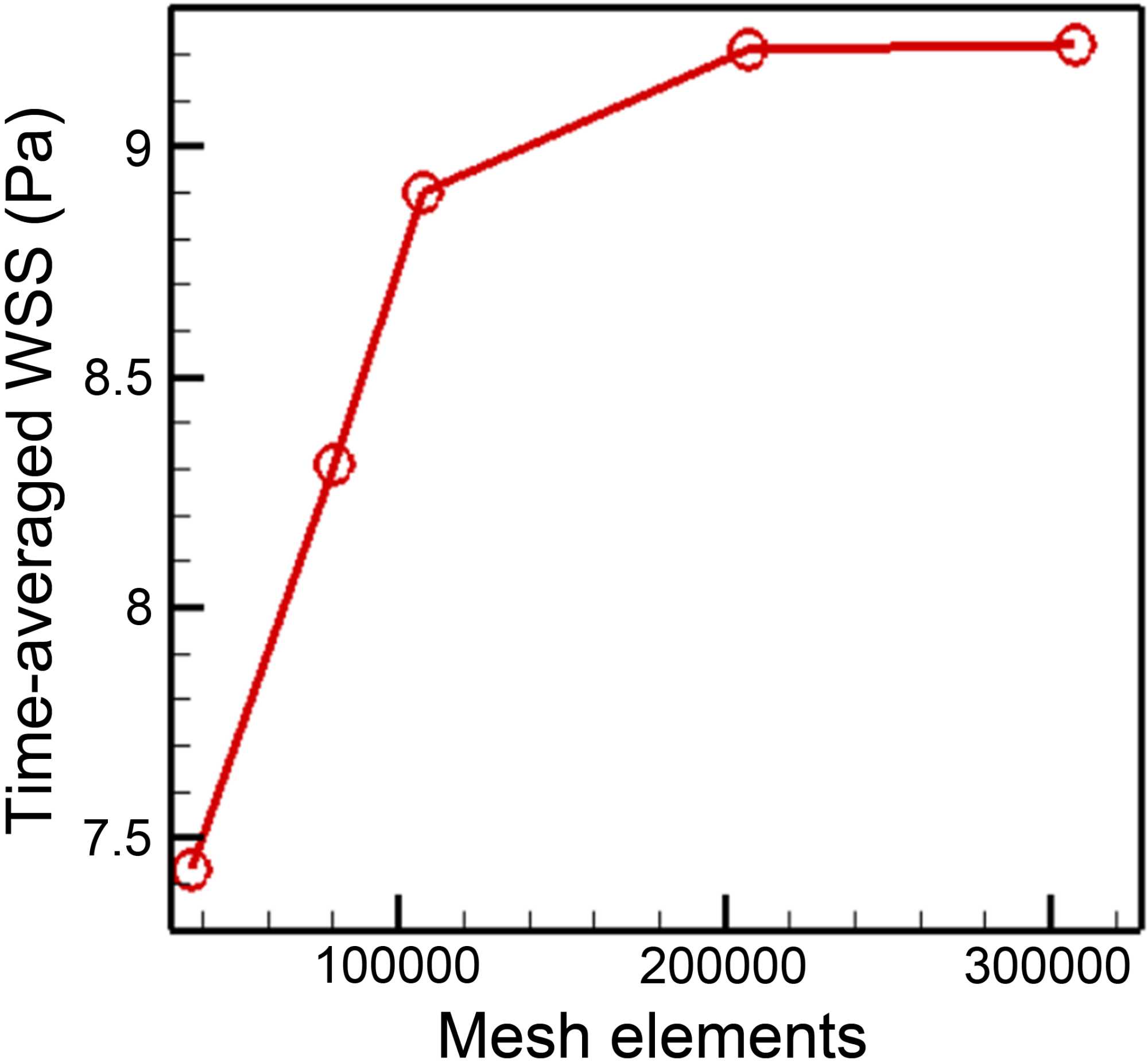 Newtonian and non-Newtonian rheological models have been assumed for incompressible, laminar and time-dependent flow. The finite element approach in the COMSOL Multiphysics software has been activated for numerical computational techniques. Time-dependent solver takes the fully coupled, advanced and iterative approach for the execution of pulsatile blood flow simulation. Different mesh densities, namely 36,405, 80,542, 107,835, 206,940, and 307,560, have been selected to decide the appropriate mesh for the prediction of outcomes. The mesh elements of 206,940 are appropriate to acquire the results because the last two elements, 206,940 and 307,560, carry approximately the same TAWSS magnitudes. Figure 3(a) shows the grid, and Figure 3(b) presents the grid test in TAWSS. In unsteady flow, the second cycle has been taken to get the simulated results.