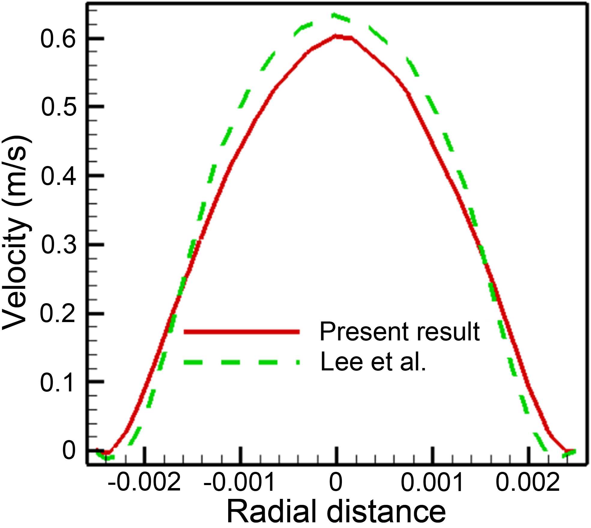 Figure 4. Axial velocity through radial direction is validated with Lee et al. [30].