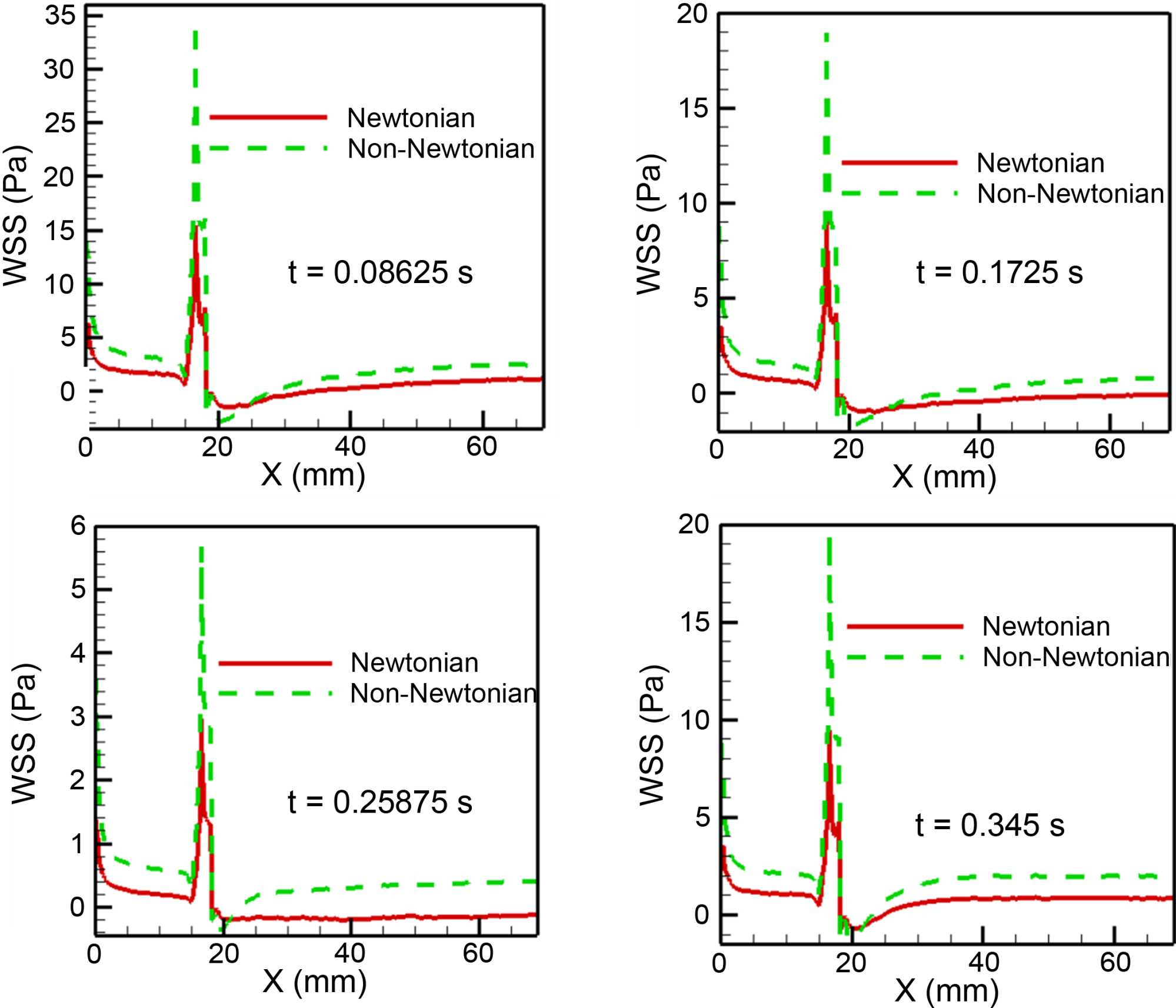 Figure 5. WSS distributions at (t = 0.08625 s, 0.1725 s, 0.25875 s, and 0.345 s) for Newtonian and non-Newtonian fluids.