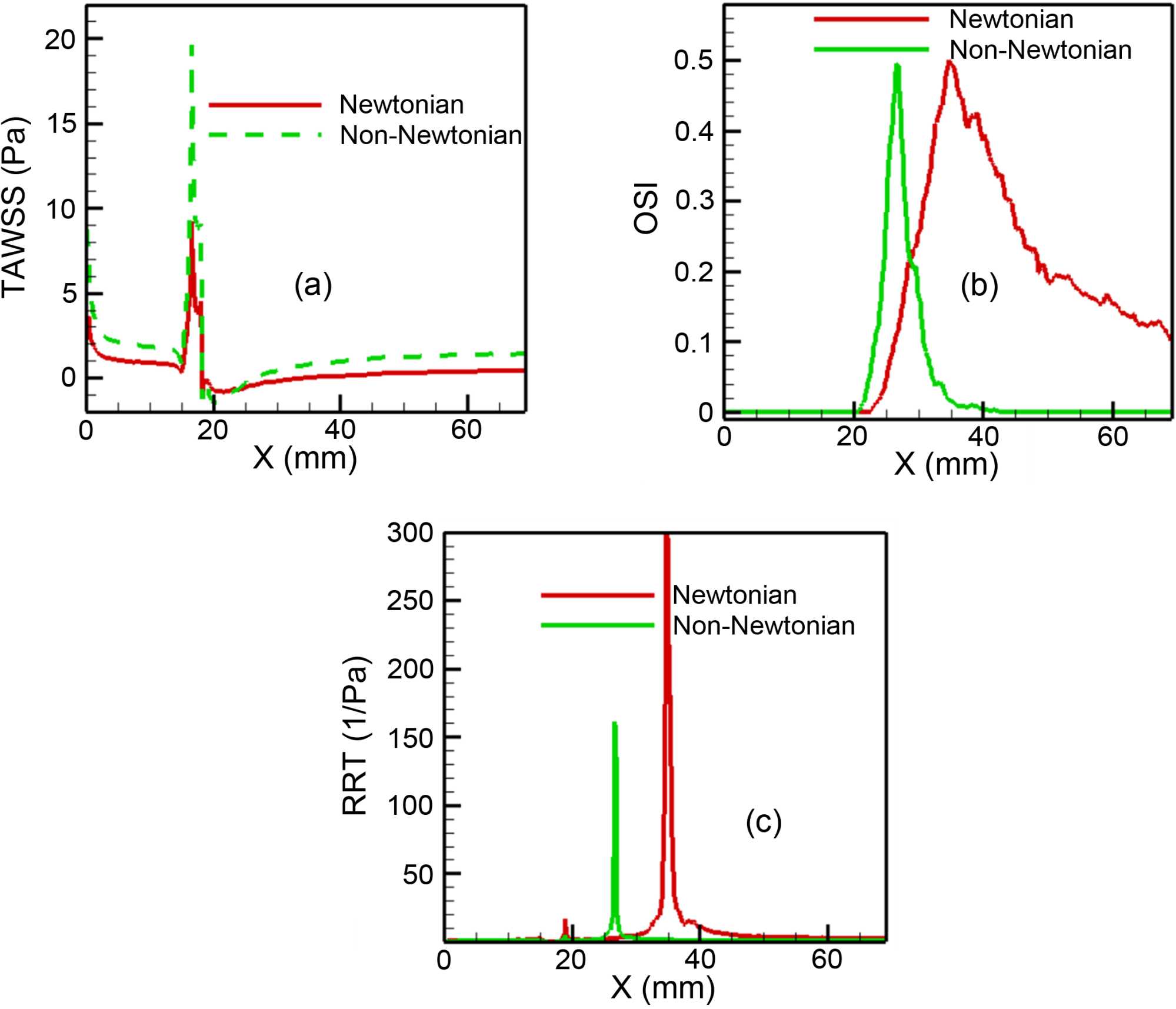 Figure 6. Distributions of (a) TAWSS, (b) OSI, and (c) RRT for Newtonian and non-Newtonian fluids.