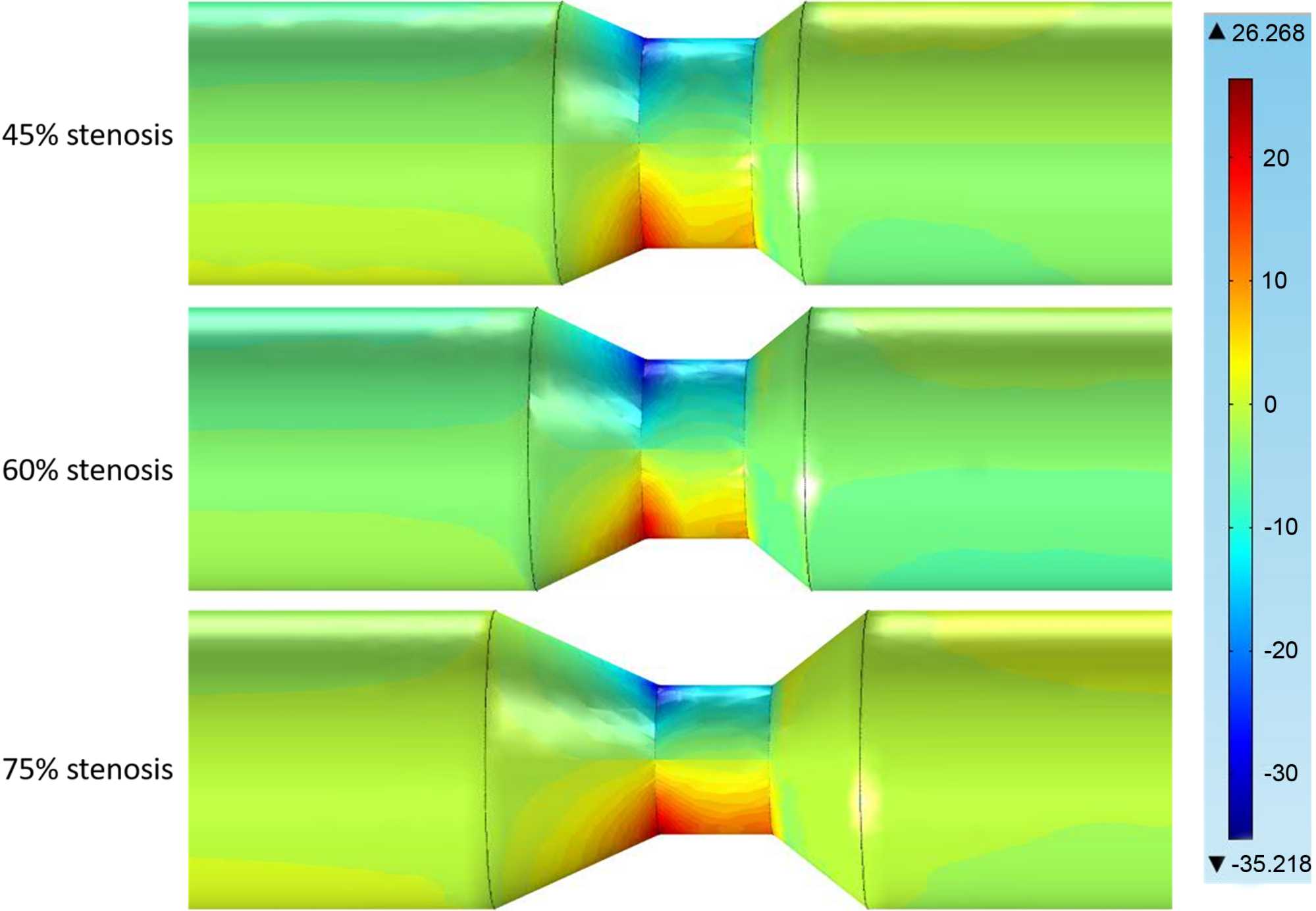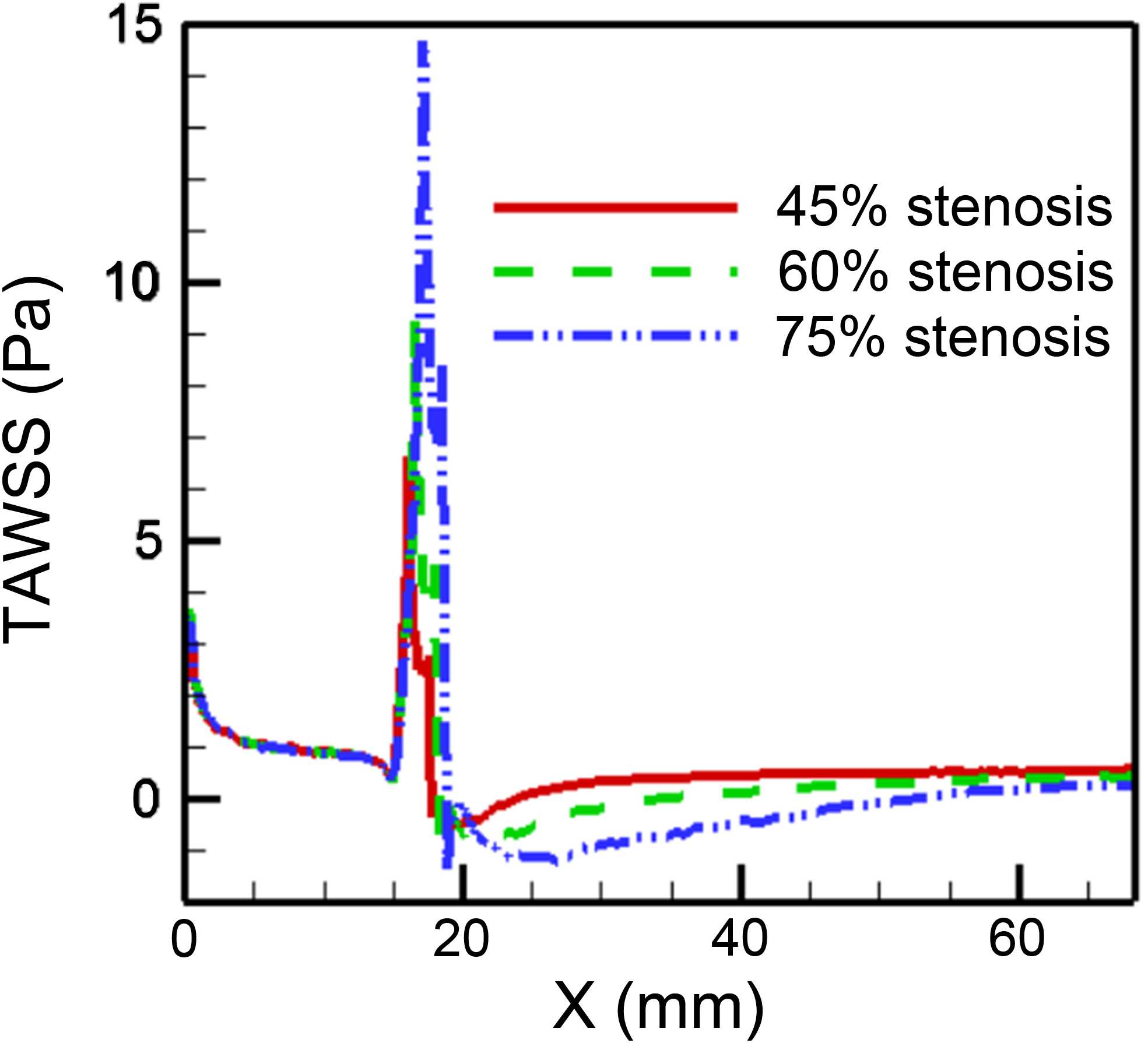 distinct sizes, specifically 45%, 60%, and 75% (Figure 7(a)), have been analyzed in terms of WSS. As the severity of the blockage deepens, the flow field diminishes, resulting in an increase in velocity, which significantly affects the WSS, leading to a peak in the WSS due to the acceleration of flow. The TAWSS for 75% stenosis rises by 54.84% and 37.18% compared to 45% and 60% stenoses, respectively. Finally, it may be concluded that the more vascular injury generates the more WSS. Figure 7(b) presents the contours of WSS distributions for the various sizes of blockage severity. At the stenosis location, the flow area is reduced and experiences a maximum shearing stress. The higher blockage (75%) attains a maximum value of WSS compared to the lower blockages.