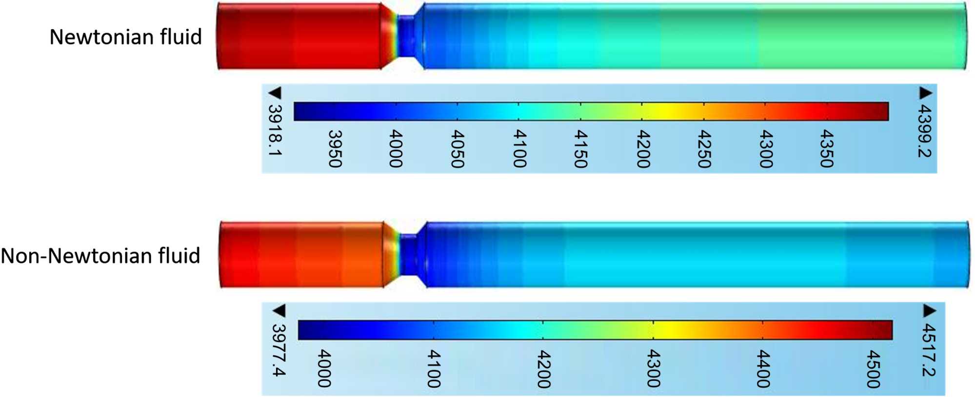 Figure 8. Pressure contour distributions for Newtonian and non-Newtonian fluids.