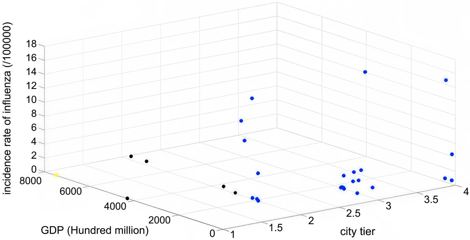 Through the three-dimensional scatter plot drawn by MATLAB, cities are divided into three categories, which are represented by blue, black and yellow, respectively. Each type of city shows different characteristics in terms of urban line level, GDP and influenza incidence (Figure 2).