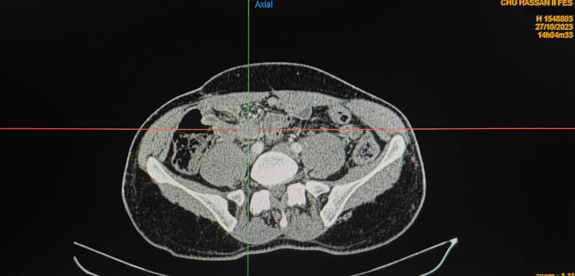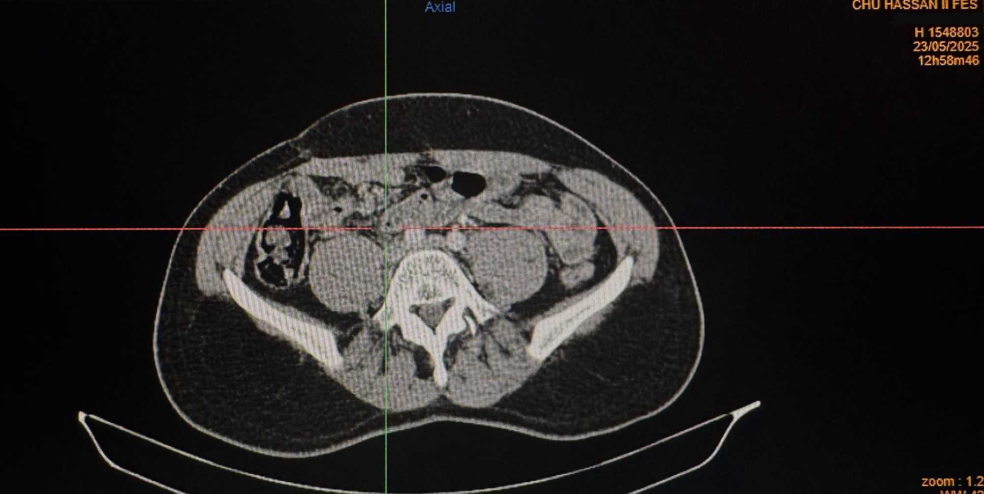 A CT scan (03/07/2022) revealed a necrotic pelvic mass suggestive of a tumoral process measuring 130 × 110 × 95 mm. The first histopathological report described non-specific suppurative changes. A second, ultrasound-guided biopsy (02/08/2022) revealed a spindle-cell proliferation. Immunohistochemical analysis was consistent with a desmoid-type fibromatosis, although molecular confirmation via detection of a CTNNB1 (β-catenin) exon 3 mutation was recommended to support the diagnosis.