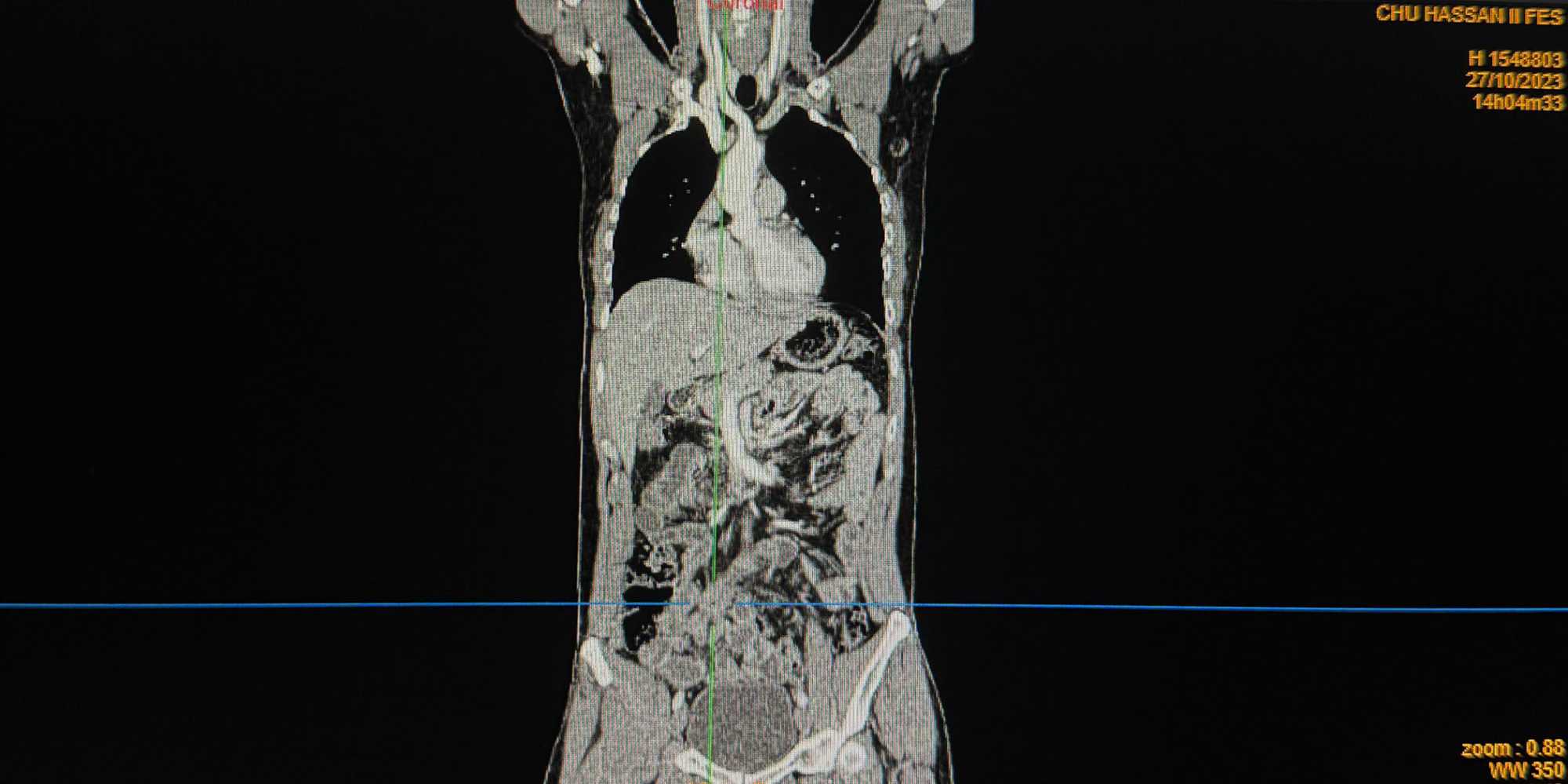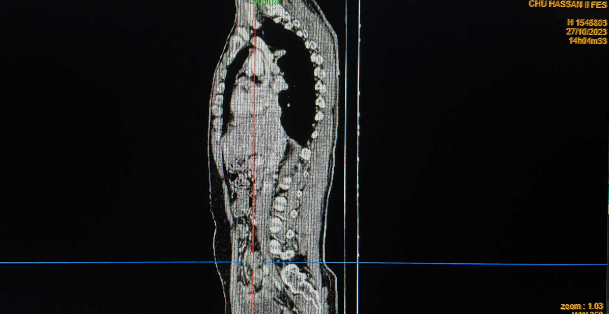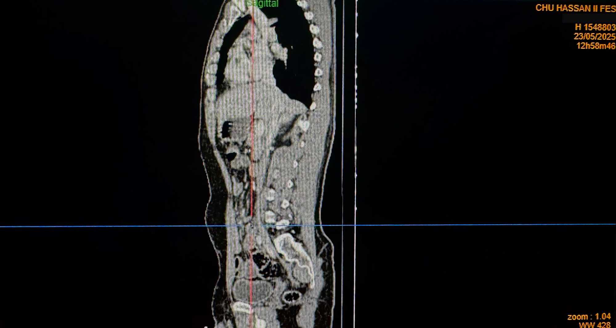 A reassessment CT scan performed on October 27, 2023 (Figures 1-4), after a year of treatment, showed partial regression of the tumor mass measuring then 30 × 18 × 34 mm.