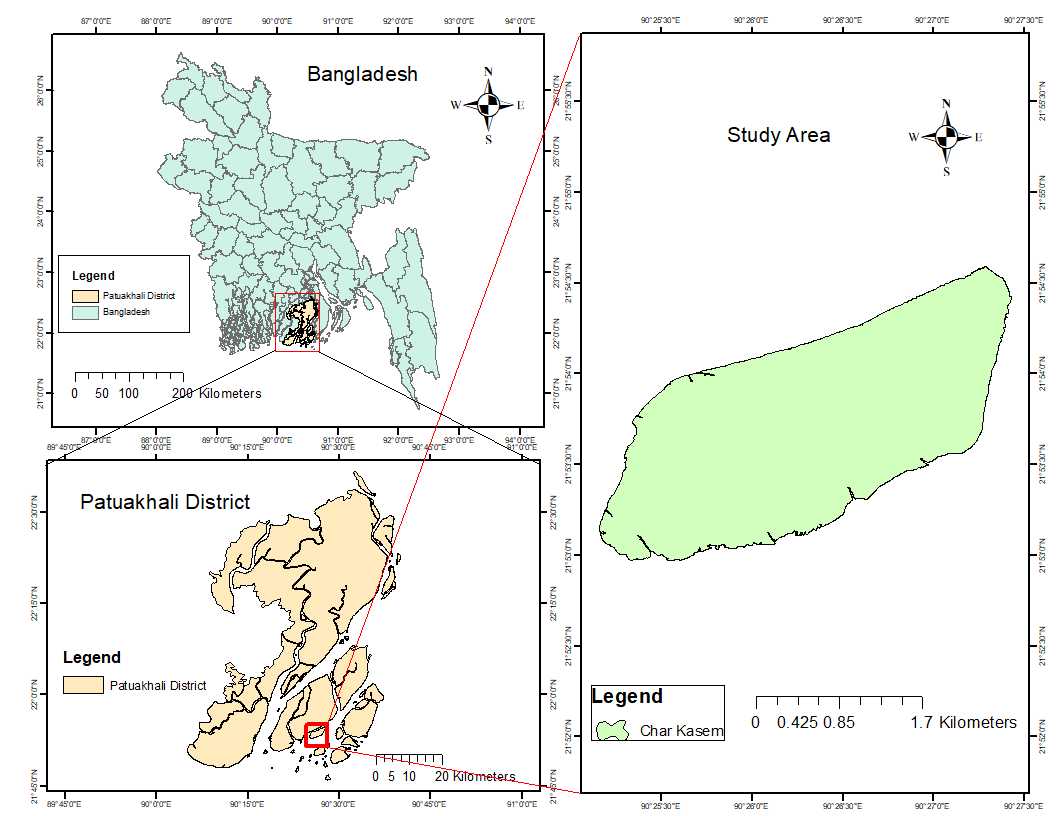 Coastal landscapes change constantly due to natural phenomena like tides, waves, currents, and human interventions [1]. Thus, these areas are highly dynamic in nature and impact the surroundings in a multi-variate way. Bangladesh is located downstream from the Ganges-Brahmaputra (GB) river basin. This basin carries a massive sediment load and confluences with the Bay of Bengal in the south. The year-round sediment deposition or siltation of the Ganges, Brahmaputra, and Meghna rivers is around 1.8 billion tons [2]. This huge sediment load settles in some areas while transporting due to confluence or a declined carrying capacity, creating mainland detached landforms known as “Char”, which can be riverine or coastal. It has been implied that the Meghna estuary zone is part of the Ganges-Brahmaputra delta, building the coastal char-lands right now [3] [4]. The annual erosion rate of these coastal chars is 50 meters to 200 meters per year [5]. The annual gain in these char-lands is 20 km2 after the erosion and accretion procedures are completed [6]. Coastal islands or char-lands, mainly located in the Meghna estuary zone, exhibit complex geomorphological characteristics leading to unpredictable changes in the landscape evolution [7]. The central coast of Bangladesh undergoes constant transformation due to hydrodynamic processes (erosion, accretion), coastal tides and currents, and counter-clockwise residual flow [8]. Intricate sedimentation processes of the Ganges-Brahmaputra delta are being controlled by continuous deposition and erosion, which shape the overall landscape of the char-lands [9]. The combination of fluvial and tidal processes shapes the dynamic landscapes of Bangladesh [10]. Apart from this, the shoreline shifting of islands and chars occurs more dominantly in the estuary zones due to seasonal floods, sea level rise, cyclones, etc. [11]. Studying these landscapes, like Char Kasem, Patuakhali, is important to understand how coastlines develop and change over time [12]. This knowledge is essential for predicting future changes, such as those caused by sea-level rise, climate change, etc., and designing coastal management plans to promote sustainability. By focusing on Char Kasem as a case study, researchers can gain valuable insights about the region’s strengths, challenges, and opportunities [13]. These findings can boost local development strategies and resource management practices in Char Kasem, which can contribute to broader coastal management strategies for Bangladesh and beyond [14].