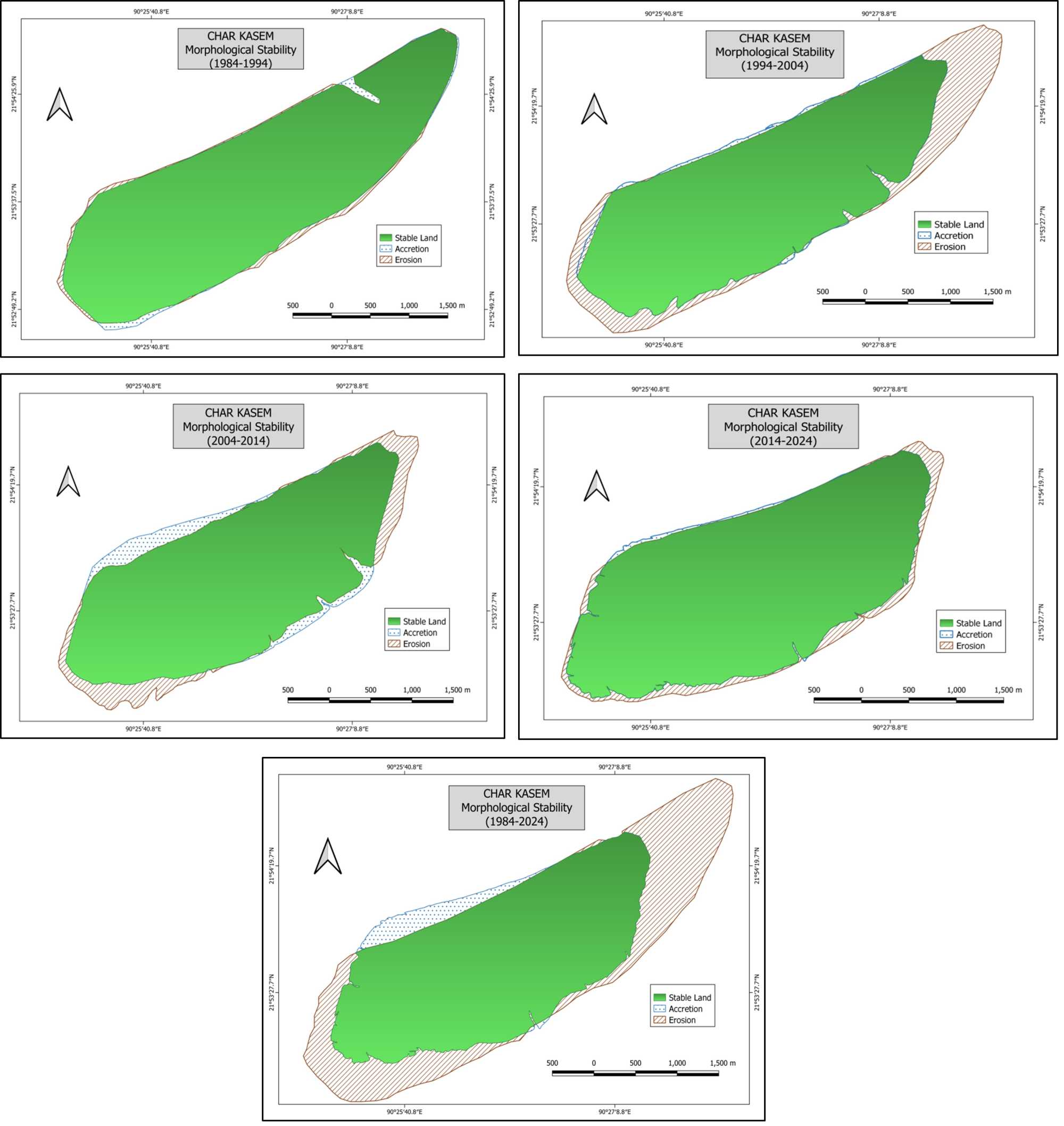 The enormous amount of land loss over the course of forty years has significantly altered the environmental state of the char. The stability of the char depends on the net rate of erosion and accretion, which have shaped the character of the char from its inception. Land stability increases the likelihood that coastal landscape size and shape will persist. As the stable land of Char Kasem underwent significant changes from 1984, so did the size and shape of the char itself. The previous phases led to a significant decrease in the quantity of stable land, which in turn determines the future of the char. If the stable area decreases significantly in the future, the char may face significant challenges regarding its sustainability. In conclusion, Char Kasem’s stability has declined since its inception. This impacted the char in changing the size and shape of the char-land. Not only this, but the environment and the people living in that char face a great deal of issues, as the char’s declining stability forces the erosion event to occur randomly all over the char, creating major problems.