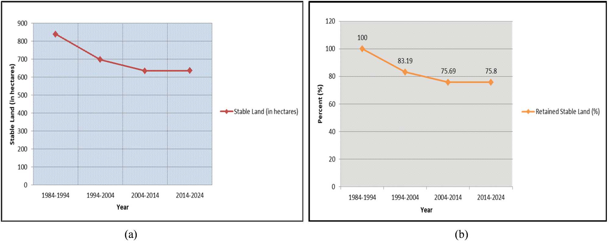 This represents an extensive negative shift within the forty-year time frame, with 225 hectares of land forfeited and 1.6 kilometers of perimeter lost. The total stable area from 1984 to 2024 is 597 hectares, with a perimeter of 13.8 kilometers. Over the first decade (1984-1994) of the analysis, 839 hectares of land remained stable (Figure 4(a)). From 1994 to 2004, the stable area decreased to 698 hectares. From 2004 to 2014, it decreased to 635 hectares. Between 2014 and 2024, the stable land increased to 636 hectares. The stability of Char Kasem has significantly declined over the past three decades, with a total of 597 hectares of stable land remaining. In the period of 1984 to 1994, considering the retention of stable land 100%, from 1994 to 2004, it had fallen to 83.19%, indicating a significant loss (Figure 4(b)). From 2004 to 2014, the retention of stable land reached 75.69%, a decrease of 24.31%, and finally, from 2014 to 2024, it reached 75.8%. This indicates a significant decline in the stability of Char Kasem. Although there has been some improvement in land retention over the past decade (2014-2024), this will be insignificant if erosion continues to outpace sedimentation in the future (Figure 4(b)).