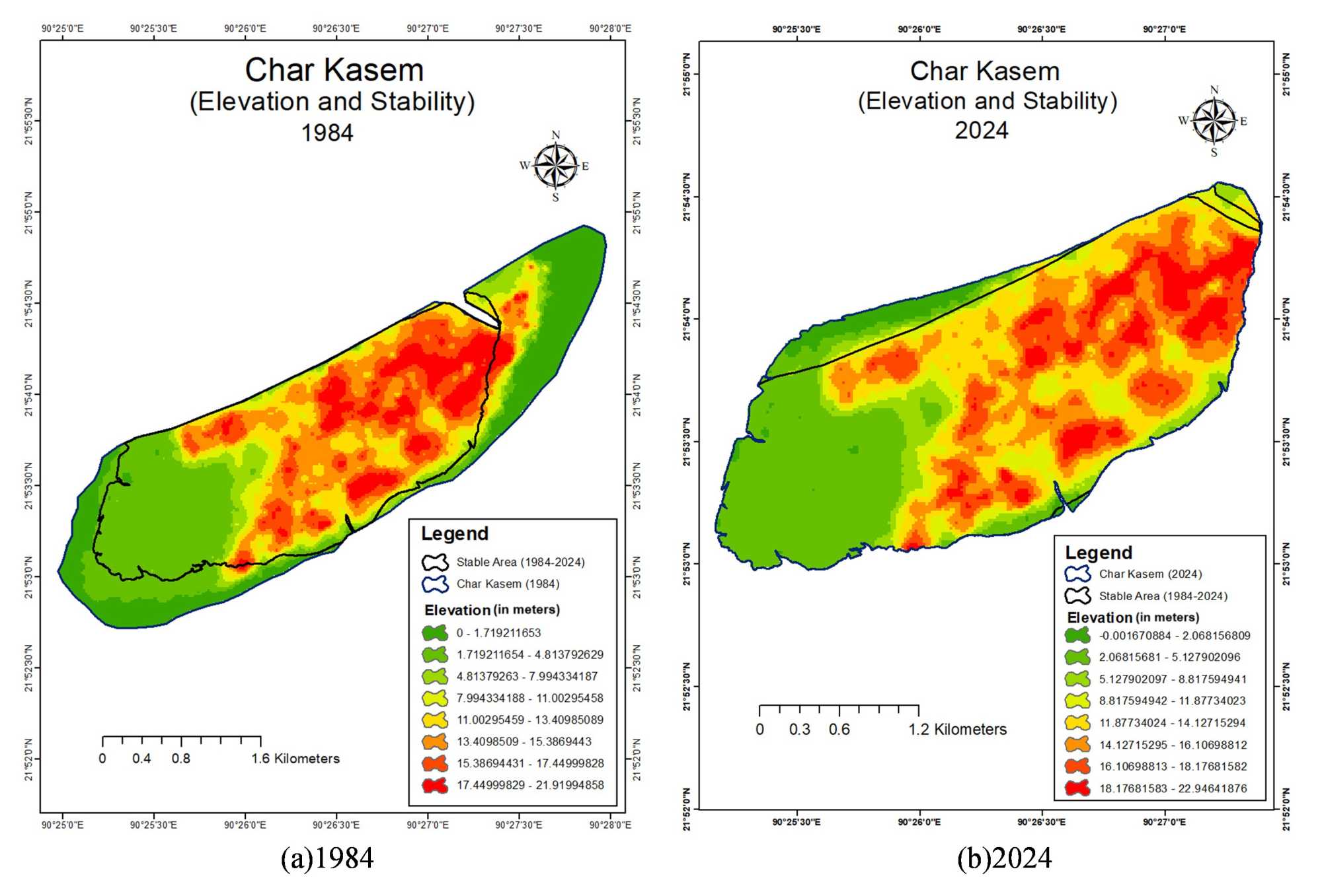 Char Kasem, a coastal char-land in Bangladesh, is primarily influenced by natural phenomena like accretion, erosion, tidal action, and river dynamics, while human activities like agriculture and construction contribute to minor changes. The study reveals that the char’s landscape changes due to varying degrees of erosion and accretion rates, as well as changing patterns in land use and land cover. The stability and shoreline of Char Kasem have been decreasing over time, indicating high vulnerability, but there has been a recent slowdown. The study emphasizes the need for sustainable coastal management strategies that target climate change susceptibility. Inadequate human activity management could worsen environmental deterioration and increase char-land instability. Implementing effective sediment management, restoring ecology, and engaging the community can improve the stability and resilience of Char Kasem. Apart from that, a comprehensive interdisciplinary strategy combining geographical, ecological, and social perspectives shall be developed for equitable development and preservation of Char Kasem.
