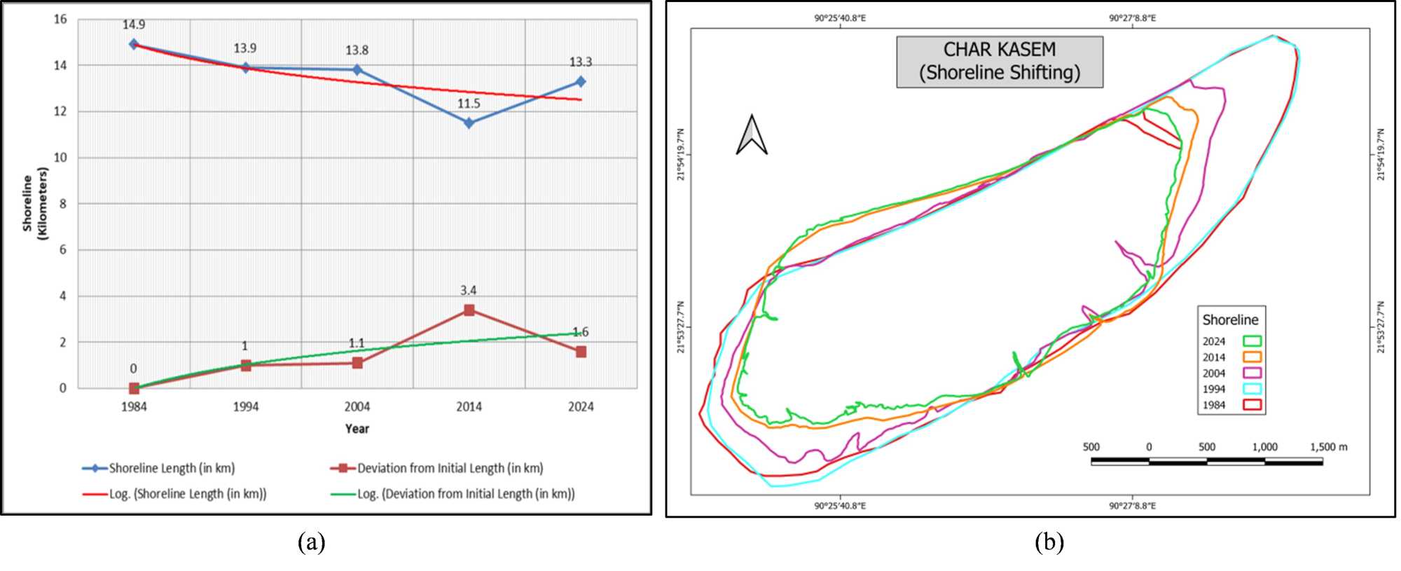 Shoreline shifting is described as the longitudinal shift of the coastline position as time goes on, impacted by a mix of natural events such as wave motion, tidal currents, sediment supply, and human interference that modify coastal dynamics [16]. The shoreline of Char Kasem in 1984 was 14.9 kilometers, which reduced to 13.9 kilometers in 1994 (Figure 6(a)). This is a huge change in shoreline as the deviation is 1 kilometer. In the year 2004, the shoreline length was 13.8 kilometers, which can be considered a minor change in shoreline, as the shoreline length in 1994 was 12.9 kilometers. So, the difference in shoreline change was 0.1 kilometers. The deviation from the initial length is 1.1 kilometers here. The shoreline length was 11.5 kilometers in 2014, which is the highest drop in the curve, as the deviation from the initial length is the highest, resulting in a 3.4-kilometer reduction of shoreline. Therefore, the char experienced a massive amount of change. This must have a long-lasting impact on this coastal char. Finally, the deviation from the initial shoreline length is 1.6 kilometers in 2024. This indicates a rise of the shoreline of 0.5 kilometers. The shoreline length is now 13.3 kilometers. This also shows an increase in total shoreline compared to the shoreline of 2014. The trend of shoreline length is shown through a logarithm, which indicates the negative trend, meaning that the shoreline of Char Kasem is decreasing with time. The trend line of deviation from initial length also shows that the reduction of shoreline is rising with time (Figure 6(a)).