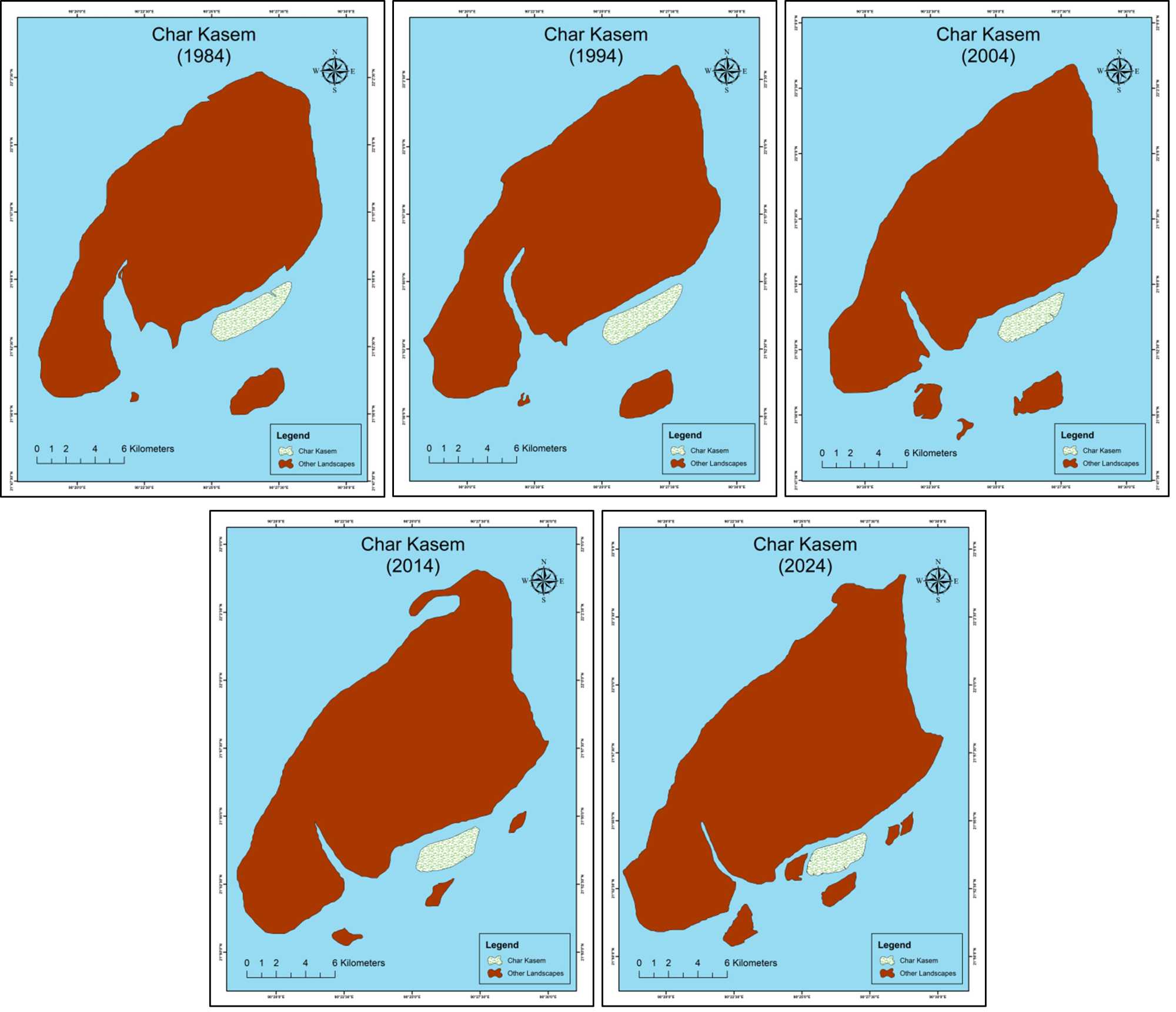 Char Kasem can be found in the western part of the Meghna estuary. To put it another way, the Meghna estuary is the region in which all of the landmasses are either being produced or being transformed by the silt that is being transported by the GBM river system, as well as the erosive strength of water. Before reaching its current form, the landscape of Char Kasem underwent a lengthy process leading up to its current appearance. The enormous amount of sedimentation that occurs in the Meghna estuary, as well as the increased erosive strength of tides and currents, had a significant impact on the area’s orientation, position, size, and form. From 1984 to 2024, a range of natural and anthropogenic events shaped the coastal char-land, leading to its current state. The terrain transformation is still taking place and will continue to do so in the years to come. The landmasses around the char also changed their size, shape, position, and orientation. During this time frame, different types of emerging and submerging char-lands can be observed. Some of the char-lands are freshly formed; some are getting bigger by accumulating more sediment, while others are getting washed away by greater erosive power (Figure 7).
