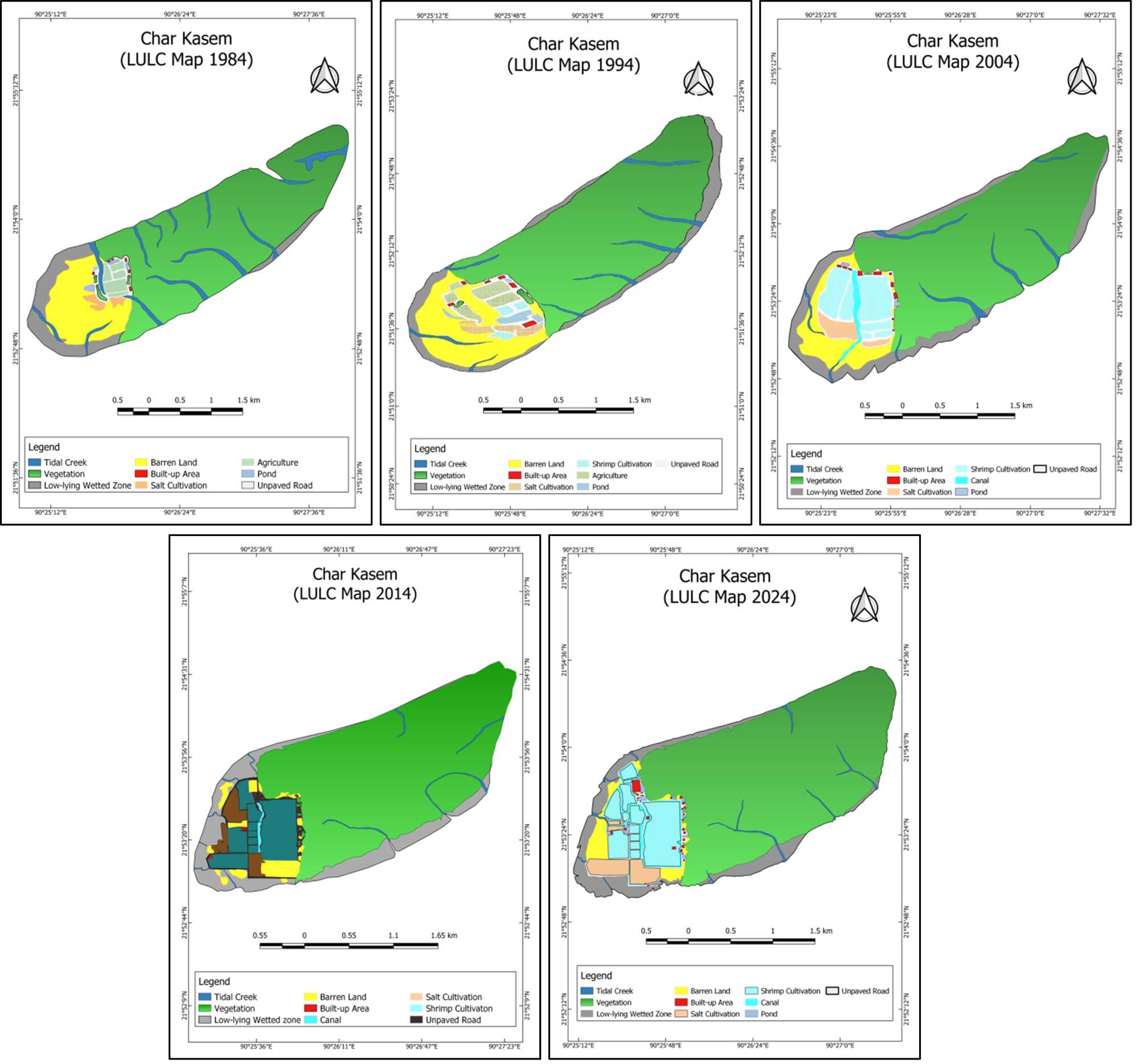 There are a total of 11 types of land use and land cover across Char Kasem, considering the time frame of 1984-2024, which include tidal creeks, natural mangrove vegetation, low-lying wetted zones commonly referred to as the intertidal zones, barren lands, built-up areas, designated areas for salt cultivation, shrimp cultivation zones, agricultural zones, ponds, canals, and unpaved roads used by smaller transport and people. These fluctuated from time to time. In 1984, significant tidal creeks were evident, and a subtle intertidal zone could be seen in the eastern part of the char. The middle section of the human-inhabited zone contains barren land, also visible as dunes (Figure 8). During that period, the formation of both landforms and vegetation was in its early stages. Given the limited number of dwellings in 1984, we can infer that many individuals had recently migrated to the char. During that period, most of the char’s territory remained devoid of human interference. Shrimp cultivation, an entirely new form of land utilization, was not present in 1984. The distribution of tidal creeks in 1994 exhibited significant disparities, accompanied by a decline in their overall magnitude. The vegetated environment remains mostly unchanged, with very slight alterations. Low-lying wetted zones extending from the shoreline encircle the char, except in specific regions. In 1994, unpaved roadways interspersed with other land uses enhanced accessibility. In 2004, the mangrove-vegetated region of the char predominantly featured tidal creeks. The erosion of the char is responsible for the reduction in the vegetated area. The char’s eroded section has formed a comparatively larger, lower-lying wetted zone encompassing the char, leaving only a tiny portion. The increasing prominence of human involvement has coincided with a notable decline in barren land. The distribution of unpaved roads within the char indicates their use for many land purposes, facilitating the transportation of commodities and enabling individuals to travel to different destinations. In former years, tidal streams were predominantly located inside vegetated terrestrial regions. However, in 2014, most tidal creeks were found in the lower section of the char, close to human settlements. At present, erosion has eroded a significant portion of the char-land, decreasing the vegetation-covered surface area compared to previous decades. A low-lying wetted zone encompassed the char, except for the northeastern region. The extent of barren land has significantly diminished due to the increase in human population and the subsequent utilization of this area for diverse reasons (Figure 8).