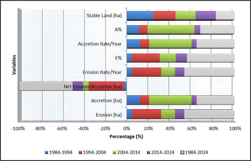 Table 1 presents the comprehensive status of the erosion and accretion phenomena that have been taking place on the char from 1984 to 2024. In addition to these factors, calculations are being made for net erosion/accretion, erosion rate, accretion rate, stable land, percentage of erosion compared to the previous decade, and percentage of accretion compared to the previous decade. The primary observation is that the erosion process is significantly noticeable, as the net erosion/accretion is consistently negative throughout the course of four decades as well as for the entire timeframe.