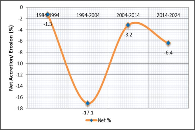 The percentage of erosion and accretion doesn’t reveal the exact trend of the processes working on the char. Hence, a comprehensive analysis of the net percentage of the processes has been done. The net percentage indicates a significant erosion process over the four decades (Figure 10). The net percentage is −1.3% in the first decade and decreases to −17.1% in the second decade, showing a substantial shift. From 2004 to 2014, the net percentage became −3.2%, and in the final decade, it became −6.4%. The graph is rising in some periods while dropping in others. The gap in the magnitude of the erosion and accretion processes is minimized in some stages, but overall, erosion still dominates the whole scenario. The graph doesn’t follow a specific trend, but the pattern is sinuous.