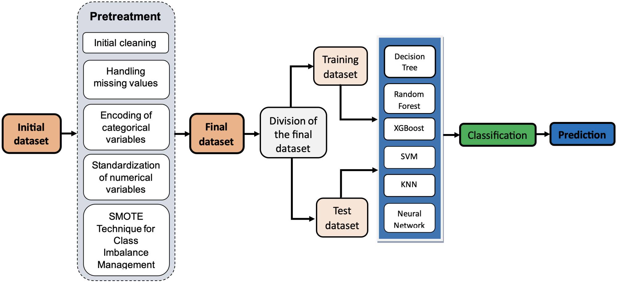 This section introduces the methodological approach adopted to predict mortality in patients with atrial fibrillation. The proposed workflow follows a supervised machine learning pipeline that includes data preprocessing, class balancing, model training, and predictive evaluation. Each step was implemented using standard tools and good practices to ensure both accuracy and reproducibility. Figure 1 below provides an overview of the system’s architecture, illustrating the overall workflow.