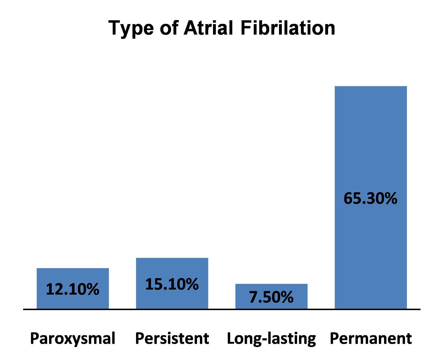 AF subtypes: paroxysmal (self-terminating episodes), persistent (requiring medical intervention), Long-standing persistent (sustained despite multiple cardioversion attempts), and permanent (accepted as the baseline rhythm).