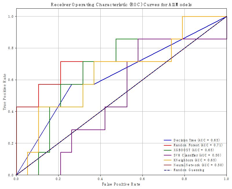 In contrast, K-Nearest Neighbors (KNN) yielded an identical AUC score of 0.65 but with a less stable curve, reflecting more variability in threshold behavior. The Support Vector Machine (SVM) and Neural Network models both performed poorly, with AUC scores of 0.50, equivalent to random guessing, indicating a lack of predictive power in this specific clinical context. This underperformance may be attributed to limited sample size, suboptimal hyperparameters, or the inability of these models to capture the underlying structure of the data given its imbalanced nature.