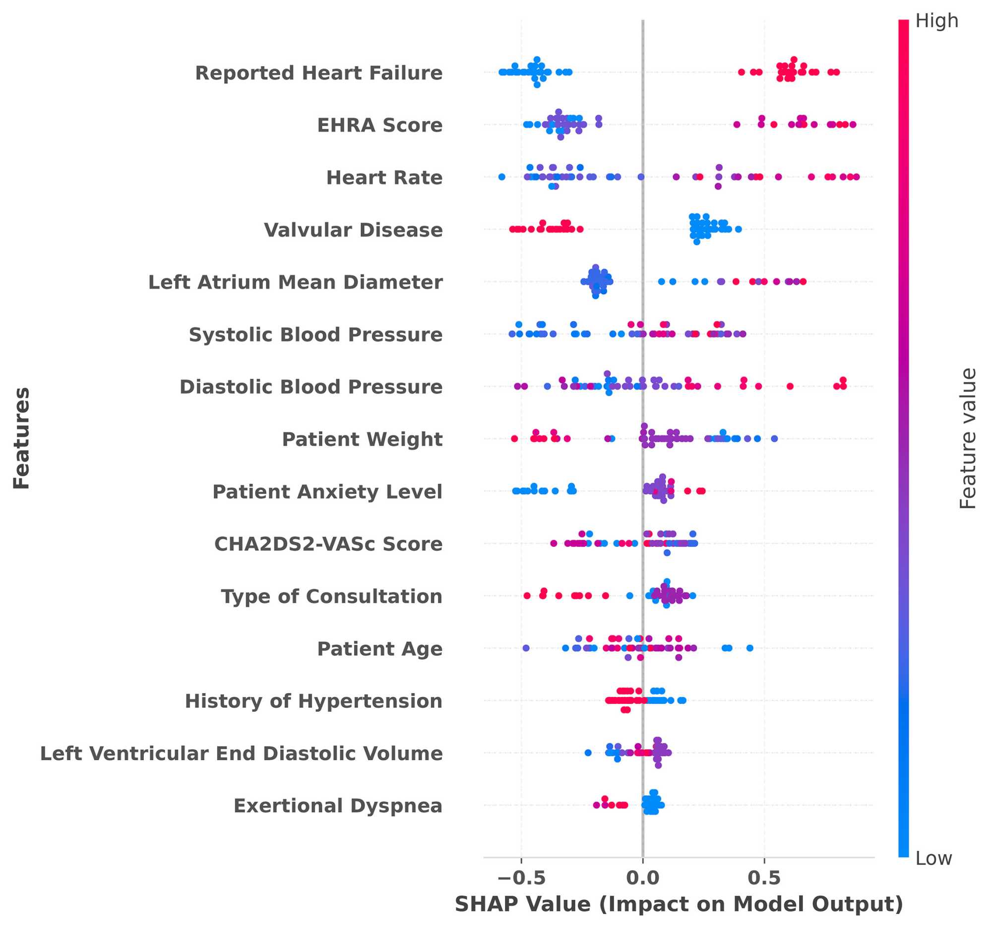 Left atrium mean diameter, systolic and diastolic blood pressure, and patient weight exhibit more balanced effects, although higher atrial dimensions and systolic pressures tend to shift predictions toward the positive class. Interestingly, patient anxiety level, CHA2DS2-VASc score, and consultation type also contribute meaningfully, indicating that both clinical and behavioral factors are taken into account by the model.