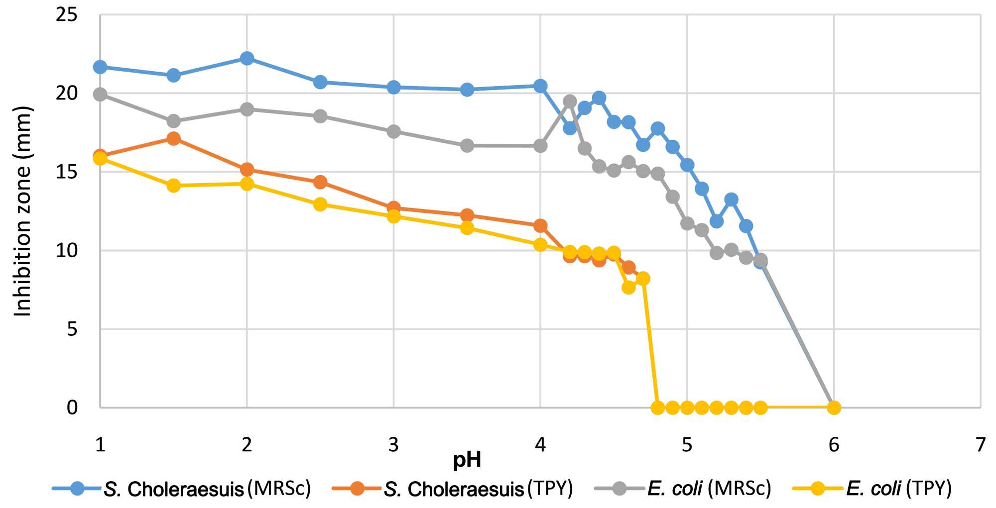 Using the agar well assay for inhibitory activity, no zones of inhibition were present against S. Choleraesuis or E. coli after beta-glycerol-phosphate buffer (pH 9.1) treatment. This indicates that the acids found within the filtrate were the only inhibitory components present and were neutralized by the added buffer.