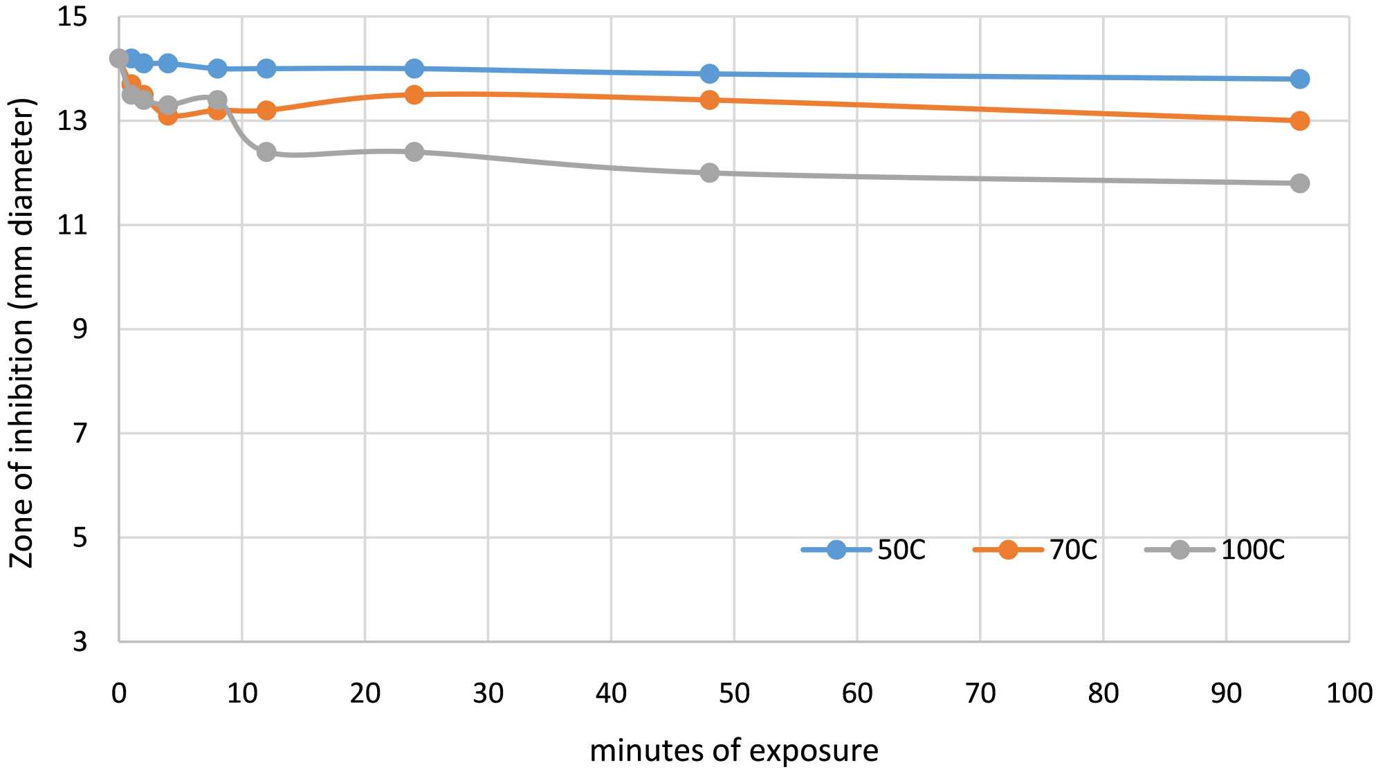 When exposed to 50˚C, 70˚C, and 100˚C for up to 96 minutes, the B. infantis filtrate grown in MRSc remained stable with no significant decrease in activity against E. coli (Figure 2). The filtrate, which had been propagated in TPY, then held at 100˚C for 90 minutes, showed no significant decline in activity. This indicates that the inhibitory substance found within the filtrate is heat-stable.