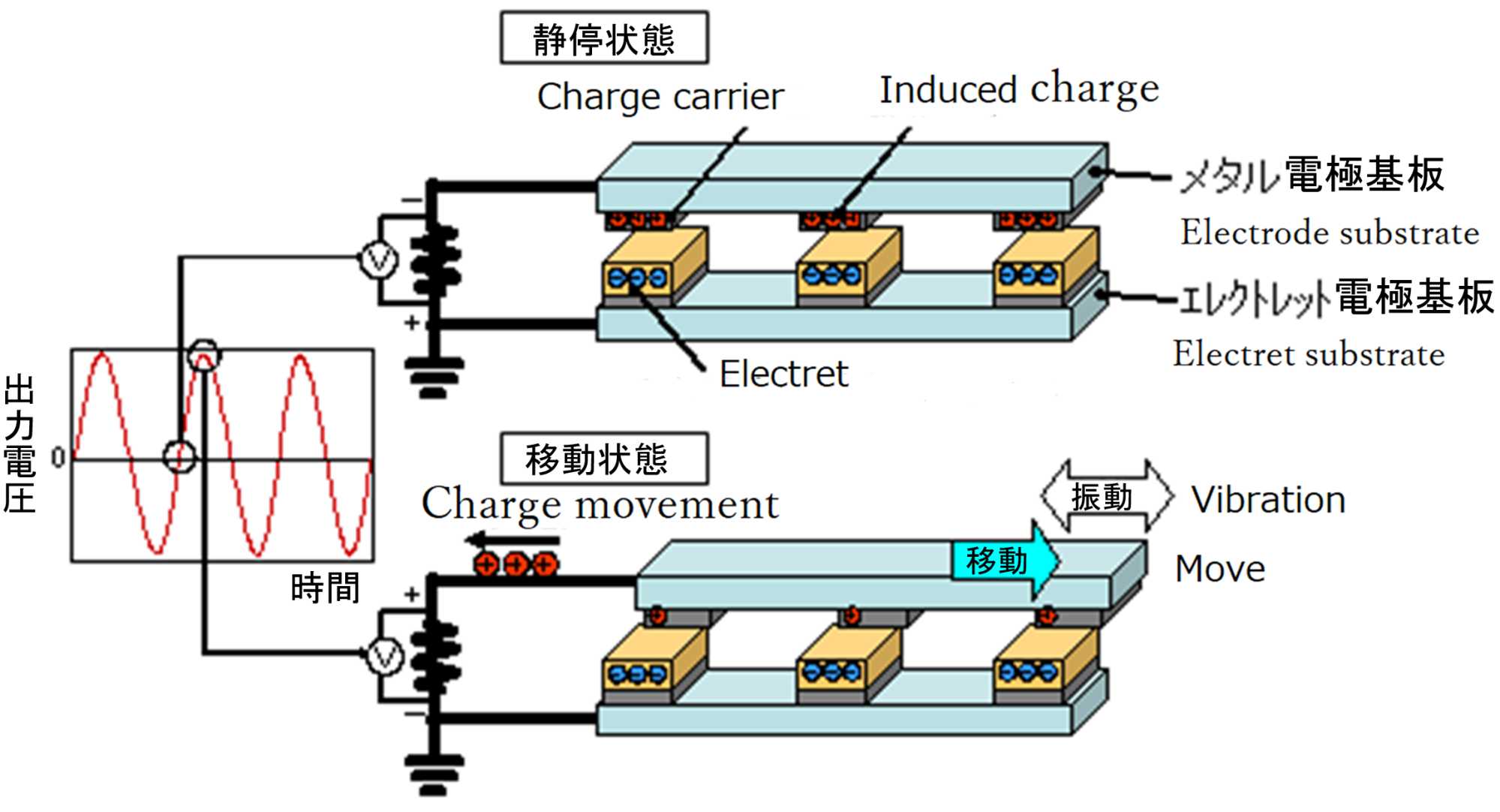 The unit primarily comprises a charge injection electret, charge collection electrode, flat-type charge carrier, and charge collection terminal.