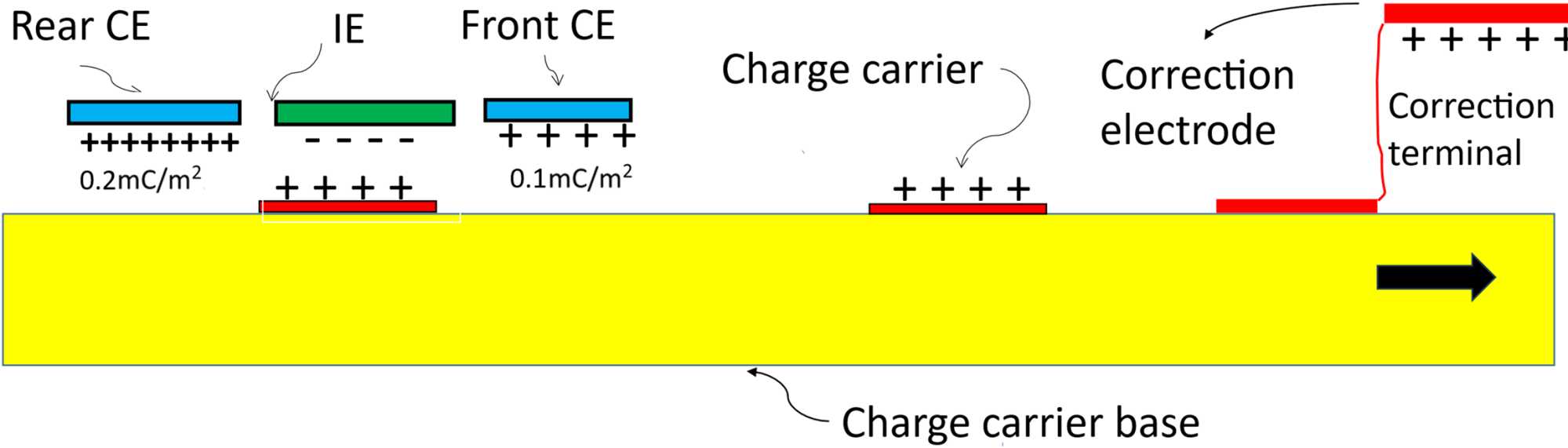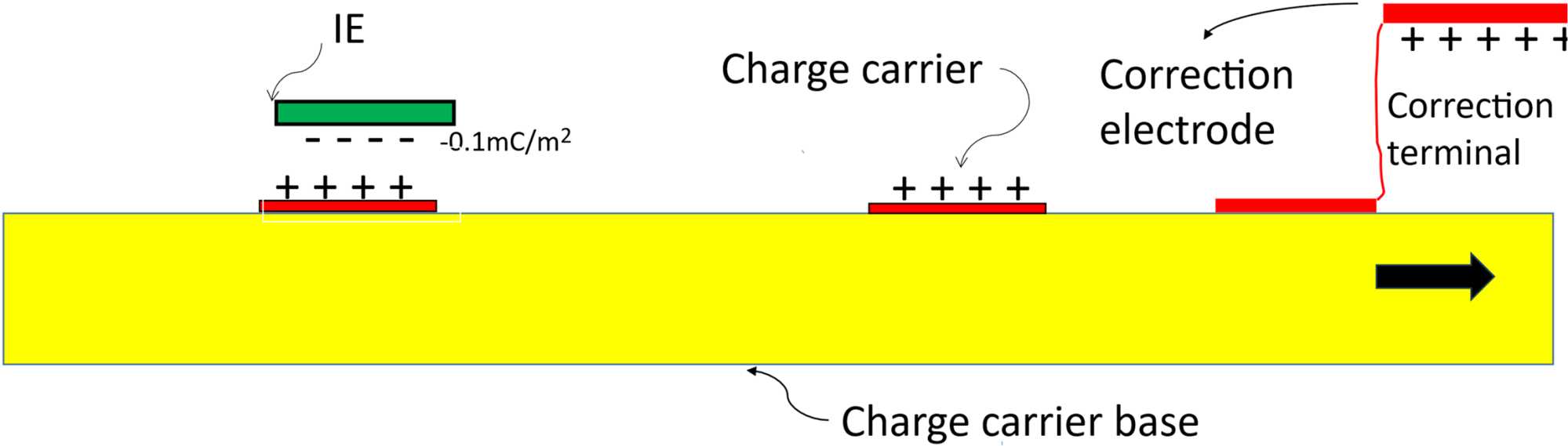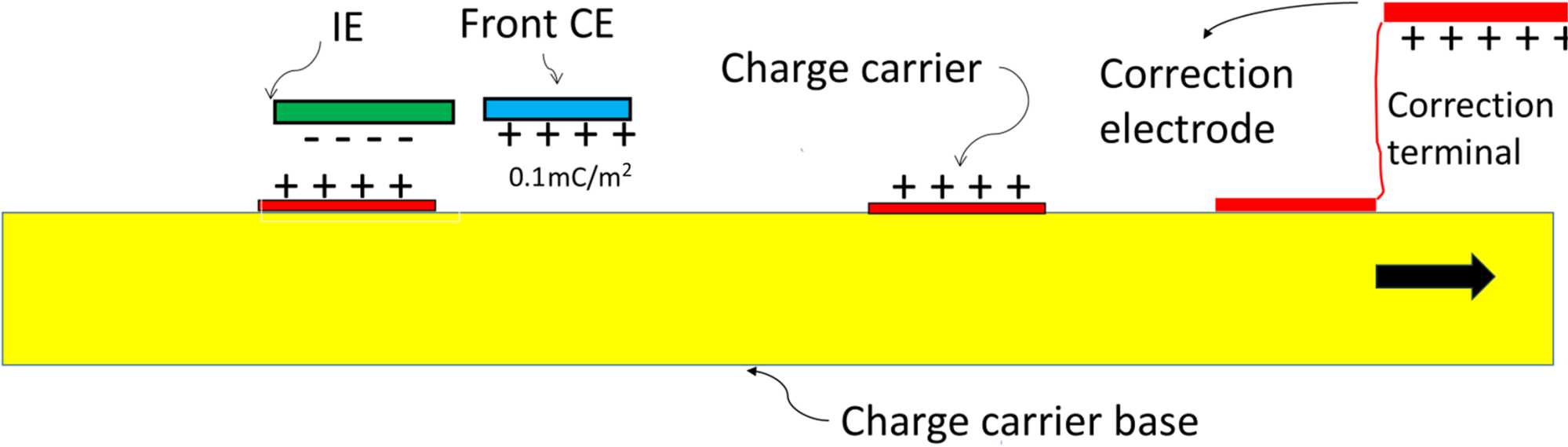 When the charge carrier moves beneath IE, positive charge is injected into the carrier via electrostatic induction.