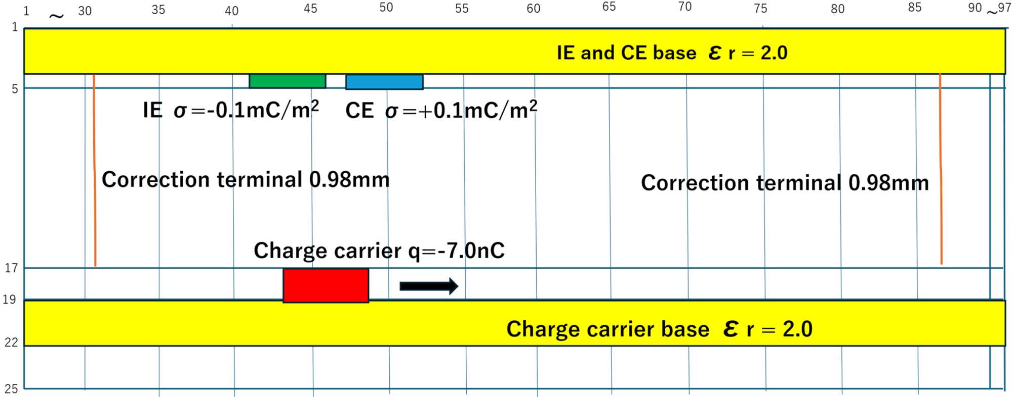 This simulation program consists of 97 lines and 25 lows. The width of between lines is all 0.5 mm. The width of between first low and fifth low is 20 μm, fifth and 17th is 80 μm, 17th and 19th is 20 μm, 19th and 22th is 80 μm, 22th and 25th is 20 μm.The permittivity of the IE and CE base, and Charge carrier base is 2.0. All parts in this simulation have a length of 200 mm from the surface to the depth.