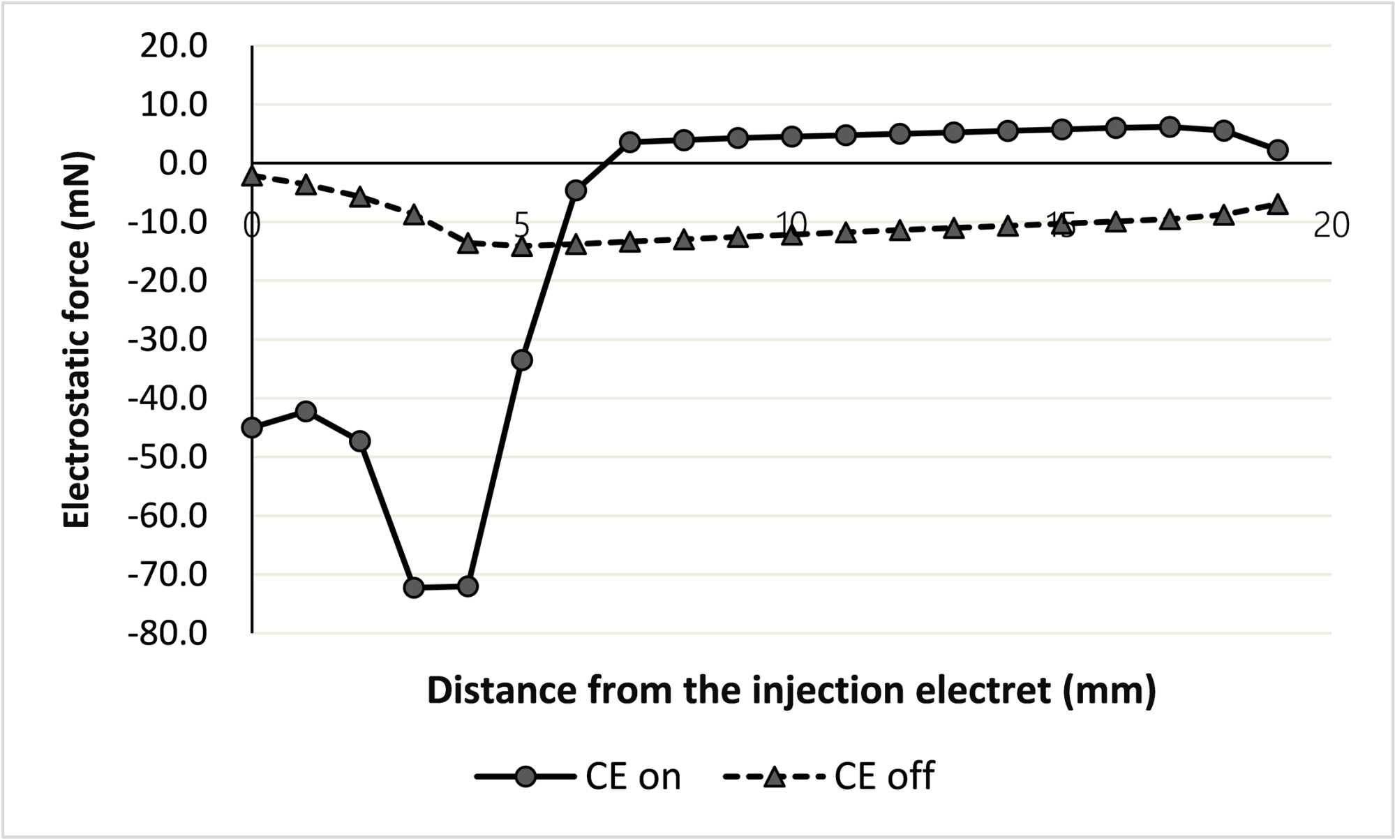 From the graph in the figure, the electrostatic force acting on the charge carrier was at all points negative, i.e., a braking force existed at all points (for a distance from 0 to 19 mm) without the CE. Consequently, an external force of 203 μJ was needed to move the charge carrier.