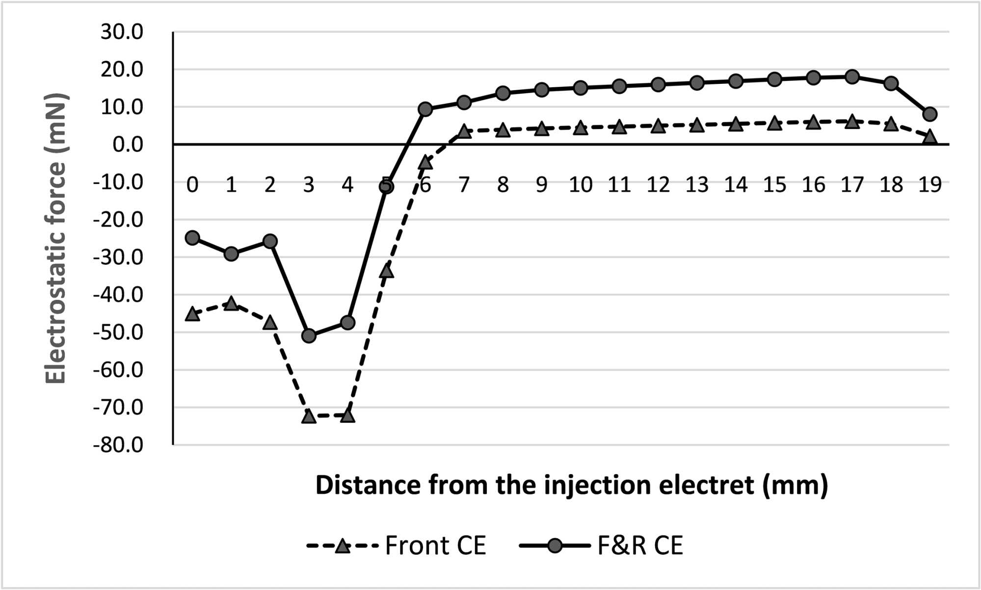 Conversely, incorporating a CE generated a negative force, i.e., the braking force, when the charge carriers passed from beneath IE through the CE (for a distance between 0 and 7 mm).