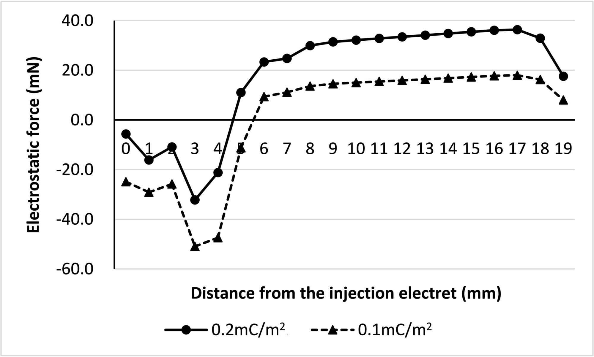 As shown in Figure 9, the braking force was approximately halved, and the accelerating force approximately doubled upon increasing the surface charge density from 0.1 to 0.2 mC/m2.