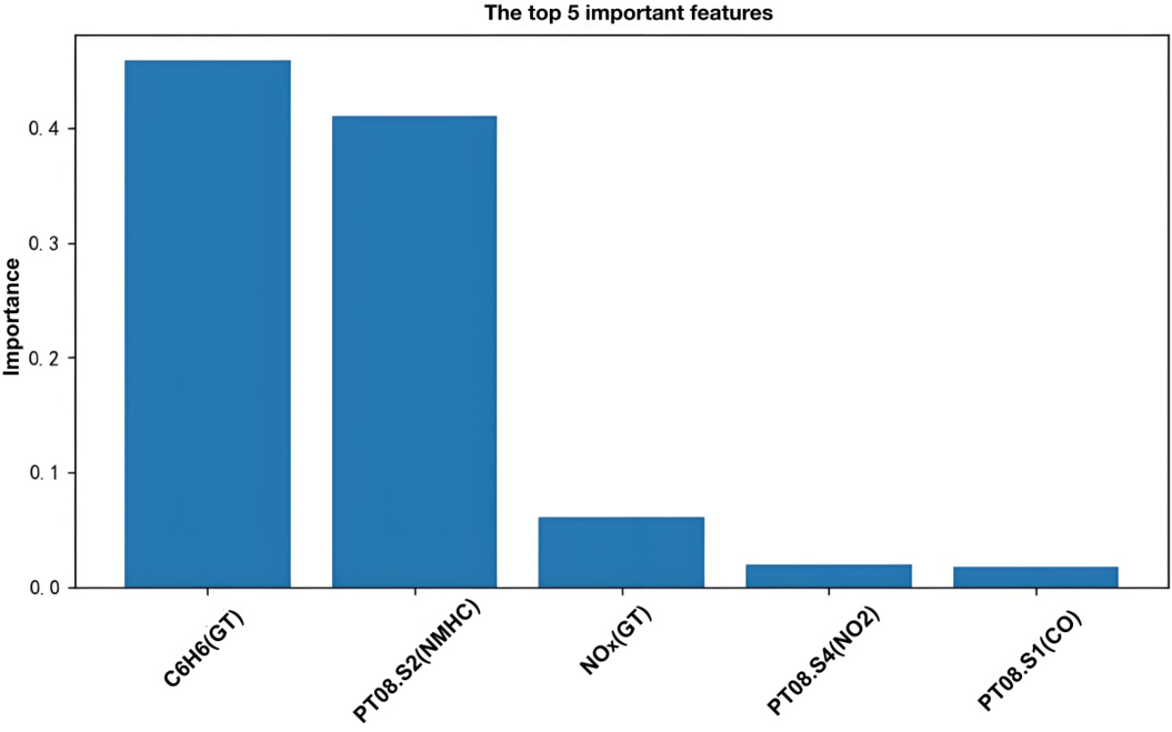 In addition to predicting CO concentration, this paper also uses the built-in feature importance calculation method of Random Forest to analyze the contribution degree of each input variable to the prediction result [7]. This method measures the importance of each feature by counting its average contribution to error reduction during splits in the decision trees. The importance scores are normalized so that they sum to 1, providing a relative measure of each feature’s influence. The results show that variables such as C6H6 (GT), PT08.S2 (NMHC), and Nox (GT) have high importance weights, making them the main factors affecting changes in CO concentration. This result not only verifies the important role of VOC and NOx in air pollution mechanisms but also provides data support for subsequent air quality monitoring and control.