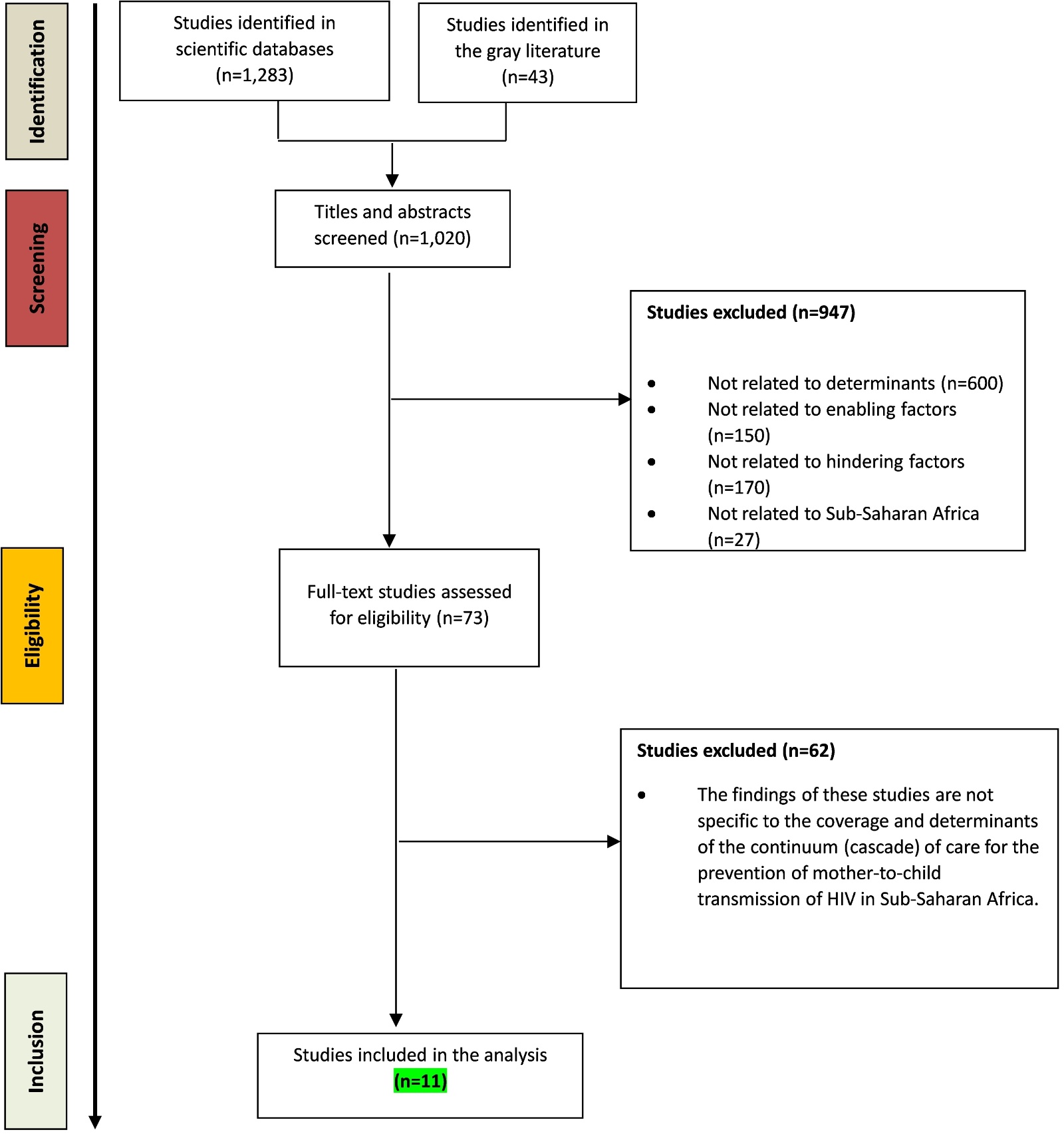 This review represents one of the few comprehensive syntheses of PMTCT coverage and determinants in sub-Saharan Africa, providing valuable evidence to inform national and regional HIV policies. However, its main limitation is that it was restricted to two databases and eleven studies, preventing full representation of all country-specific realities.