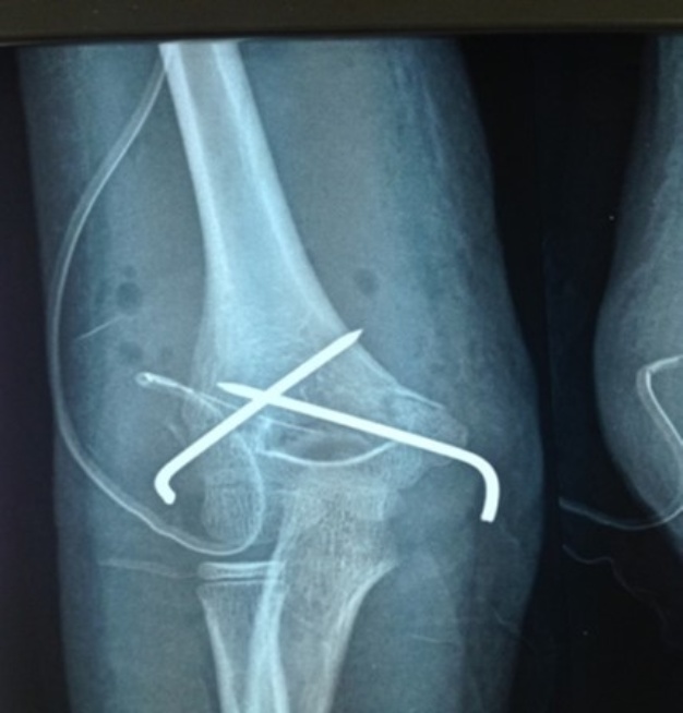 In 54.7% of cases, surgical intervention involved open reduction through a posterior approach and cross pinning (as seen in Figure 2). This finding aligns with the results reported by Fernandez et al. [18]. Due to the absence of a fluoroscope, the open reduction is visually assessed, followed by X pinning. Post-pinning, no elbow immobilization is applied in our patients.
