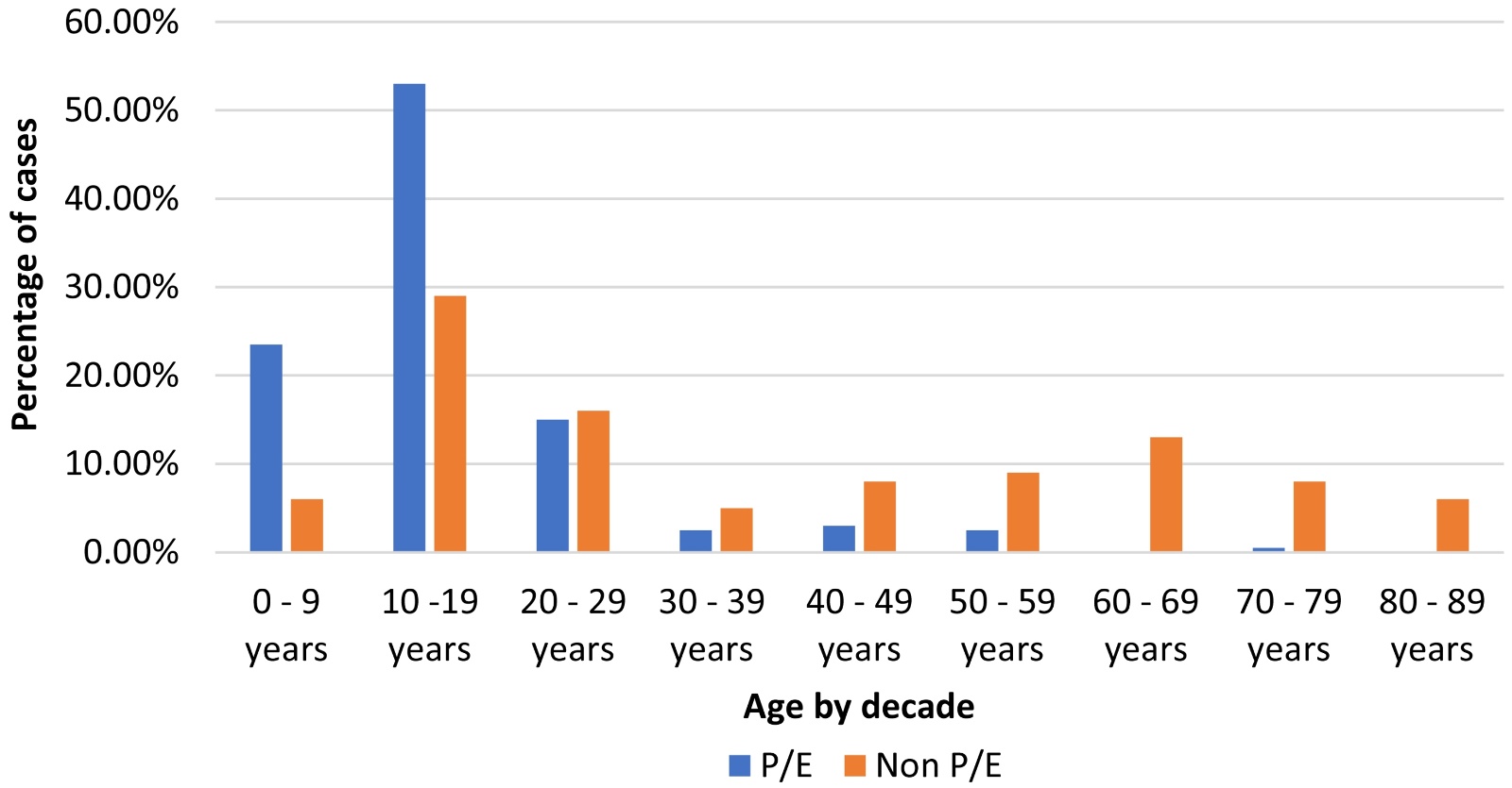 Figure 1. Percentage of patients with and without P/E syncope per decade.