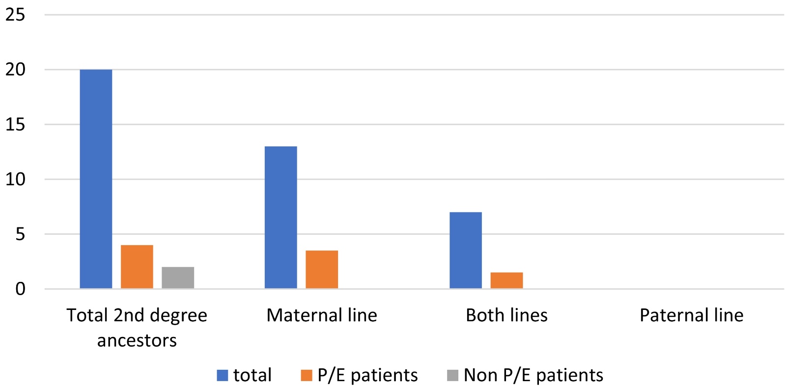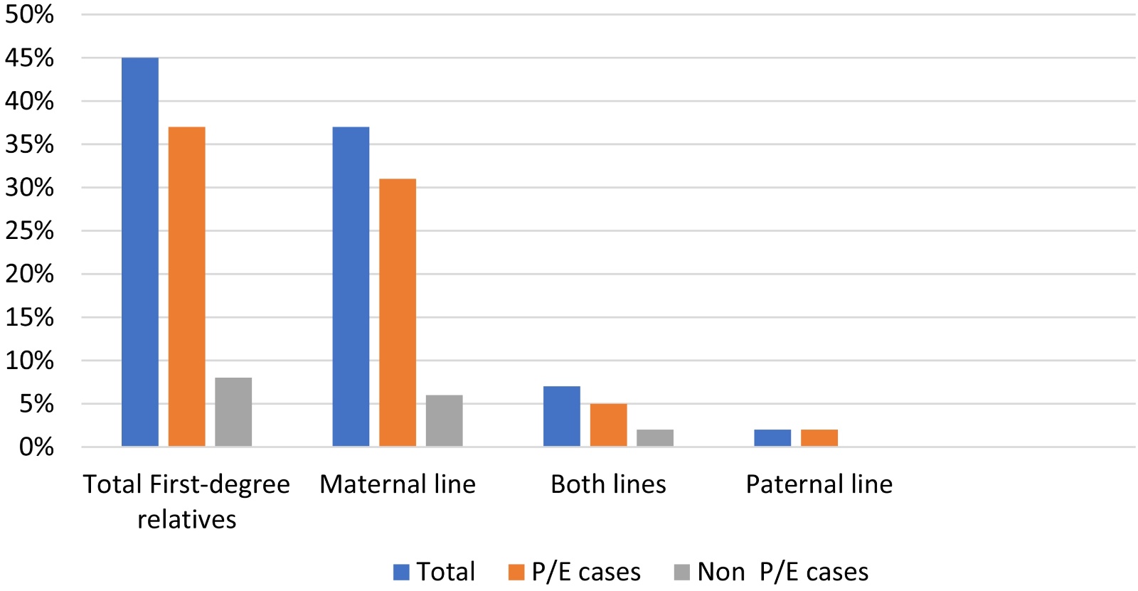 In our P/E patients (n = 188), we found a history of syncope in these first-degree relatives (83/188 = 44% frequency). Inheritance occurs mainly through the maternal branch (83%), more often than through both branches (maternal and paternal) (14%), and rarely only through the paternal line (3%) (p ≤ 0.05).
