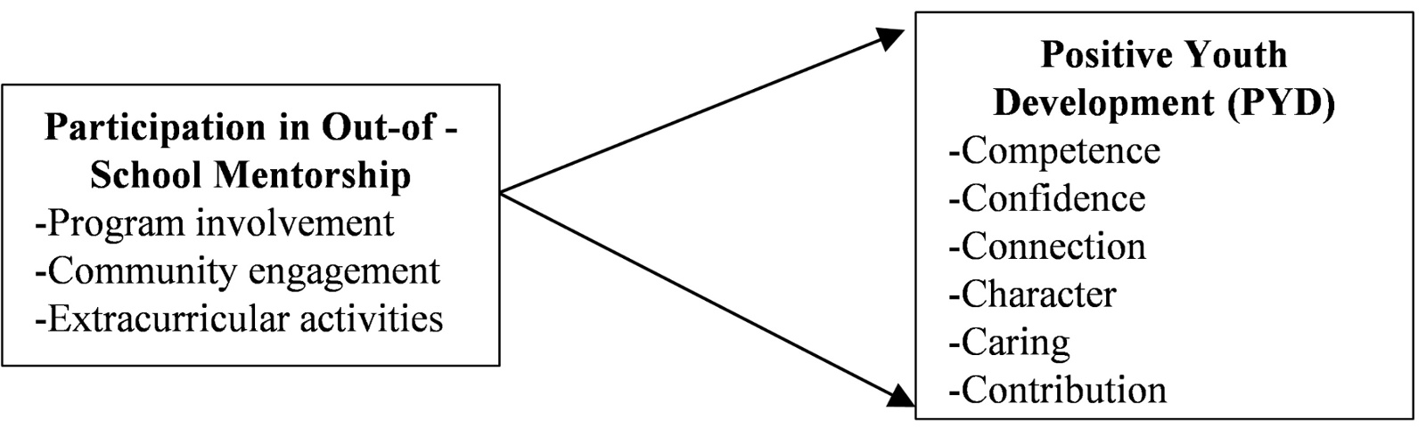 The framework for this study identifies Participation in Out-of-School Mentorship as the main independent variable, which includes program involvement, community involvement, and extracurricular involvement. Parental support is viewed as an important context, given the ability of the family to support youth Participation and wellbeing, and is demonstrated through economic support, communication, home context, connectedness, and overall active engagement in the child’s life. Positive Youth Development (PYD) is the dependent variable of this framework, conceptualized through Lerner’s 5Cs/6Cs model: competence, confidence, connection, character, caring, and contribution. The framework draws on the PYD approach to youth, conceptualizing youth as agents with strengths that can be harnessed through planned interactions and supports. The framework is also informed by Rhodes’s conceptual model of mentorship, specifically how relational processes, including trust, guidance, role modeling, and reciprocity, relate to developmental outcomes. Each of these models collectively highlights that when youth have opportunities for structured mentorship, with enabling family and social scenarios, they are likely to develop in multidimensional ways, as illustrated in Figure 1.