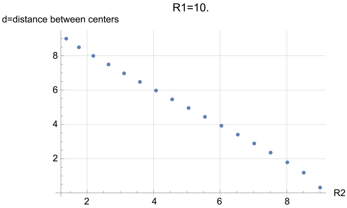 In other words, R1, R2, and d are related. By choosing a numeric value for R1 and d, R2 can be determined. By applying the CAS mentioned above [5], we seek its permissible value. For example, consider the radius of the large cylinder in Figure 1, which is colored blue, to be ten units, R1 = 10. Separating the centers of the cylinders, d = 1, …, 9 gives the allowed values of R2, [6].