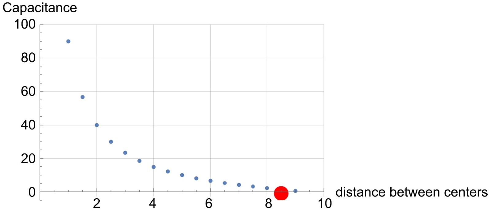 Figure 7. Display of the capacitance of a non-concentric capacitor, Equation (14), vs. the separation distance between the centers.