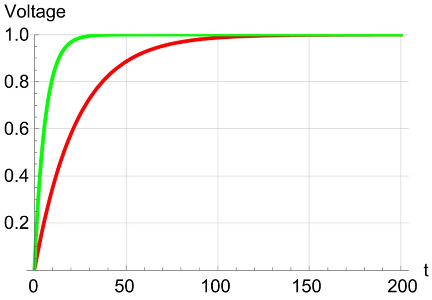 {tabledata[[15,6]],(Log[10/tabledata[[15,2]]])−1}={2.30744,0.581159}. The capacitance of the symmetric capacitor is ~173% smaller than that of the non-concentric one. And as expected, the larger capacitor, shown in red, reaches saturation voltage at a slower rate.