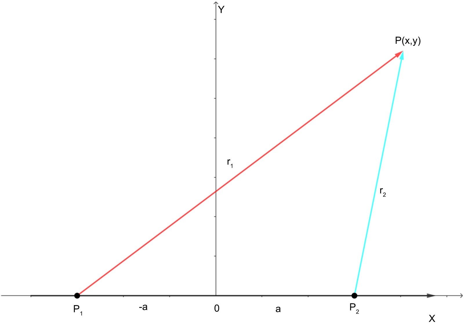 2b. Step 2. By inserting two long, parallel, oppositely charged tiny rods, shown in red and the other one in blue, respectively, see Figure 3. The previous setting replaces the geometric problem with an electrostatic physics problem. The electrostatic potential at the last point,