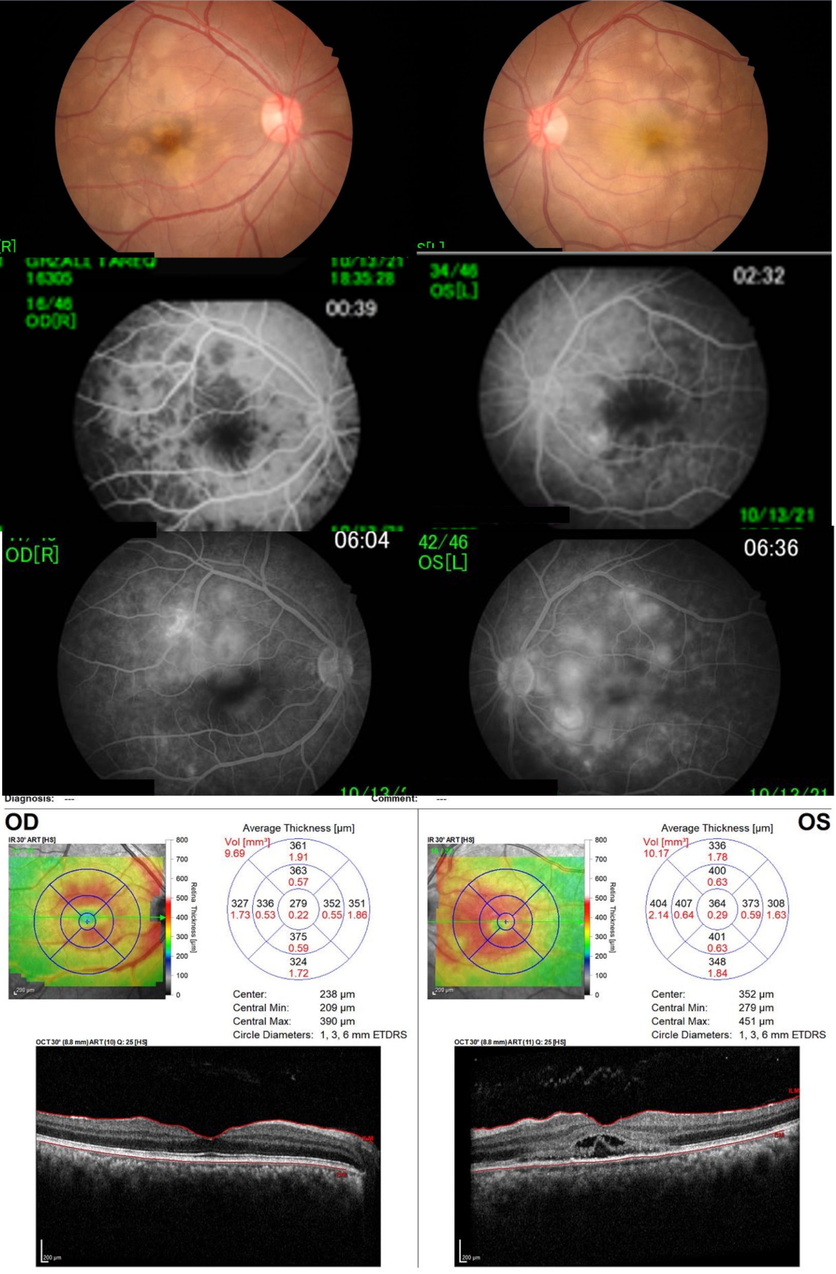 After one week, the patient returned with decreased vision in both eyes: BDVA 20/70 (OD) and hand motion (OS). Fundus examination revealed bilateral dense vitreous cells (+4) and multifocal choroiditis, which was diffuse and confluent in the left eye. Optical coherence tomography (OCT), fundus photography, and fundus fluorescein angiography (FFA) were performed and showed bilateral choroidal and retinal infiltrates (Figure 1) with loss of choroid-retinal differentiation, along with left subretinal and intraretinal fluid and loss of the photoreceptor layer. Laboratory work-up was conducted, revealing negative findings for infectious diseases (such as tuberculosis, syphilis, toxoplasmosis, and herpes viruses) and autoimmune diseases (including antinuclear antibodies, rheumatoid factor, HLA-B27, and ACE level). Systemic steroid therapy was initiated in the form of 2 mg/kg prednisolone tablets (single dose in the morning).