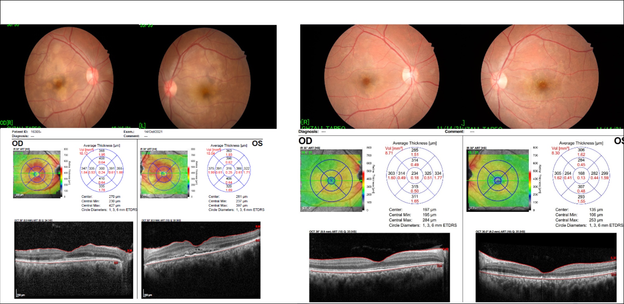 Figure 2. Shows color fundus photos from left to right. The images show a gradual resolution of the choroidal infiltrates and atrophic changes in the retinal pigment epithelium. The OCT shows resolution of chorioretinal infiltrates and subretinal and intraretinal fluid, with recovery of the outer retinal layers in both eyes; however, a loss of the photoreceptor layer is noted in the left eye.