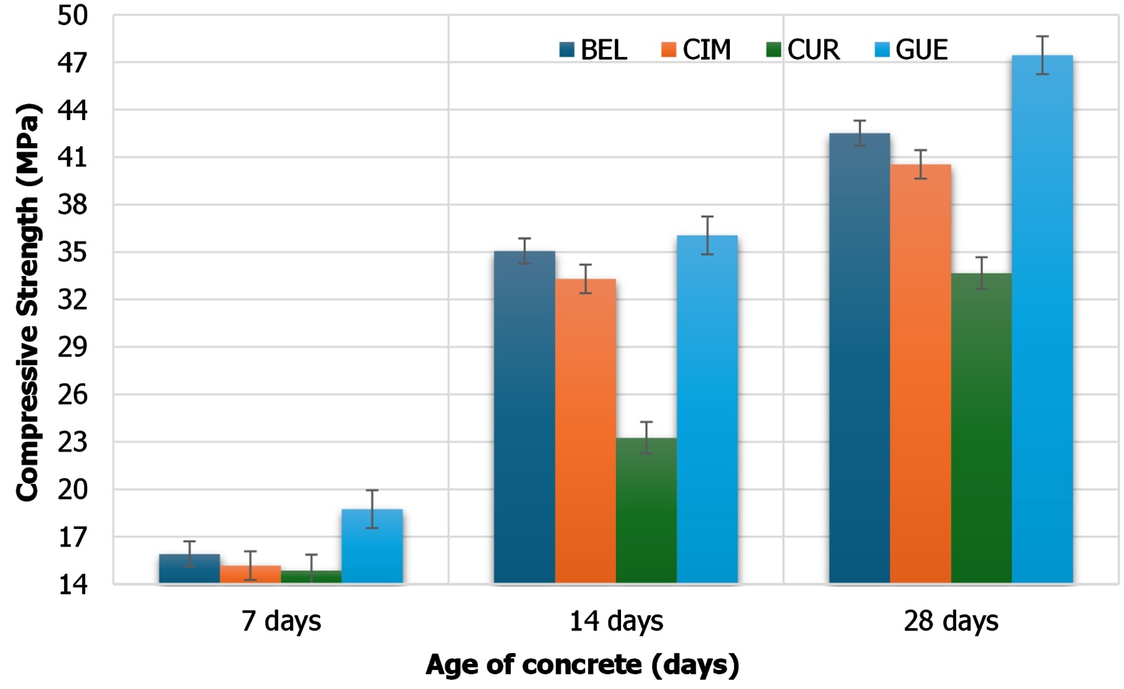This study comparatively assessed the influence of four types of local cements (BEL, CIM, CUR, and GUE) on the physical and mechanical properties of concrete at 7, 14, and 28 days. The specimens were prepared using an identical formulation and subjected to the same implementation and curing conditions to ensure a rigorous and objective analysis.