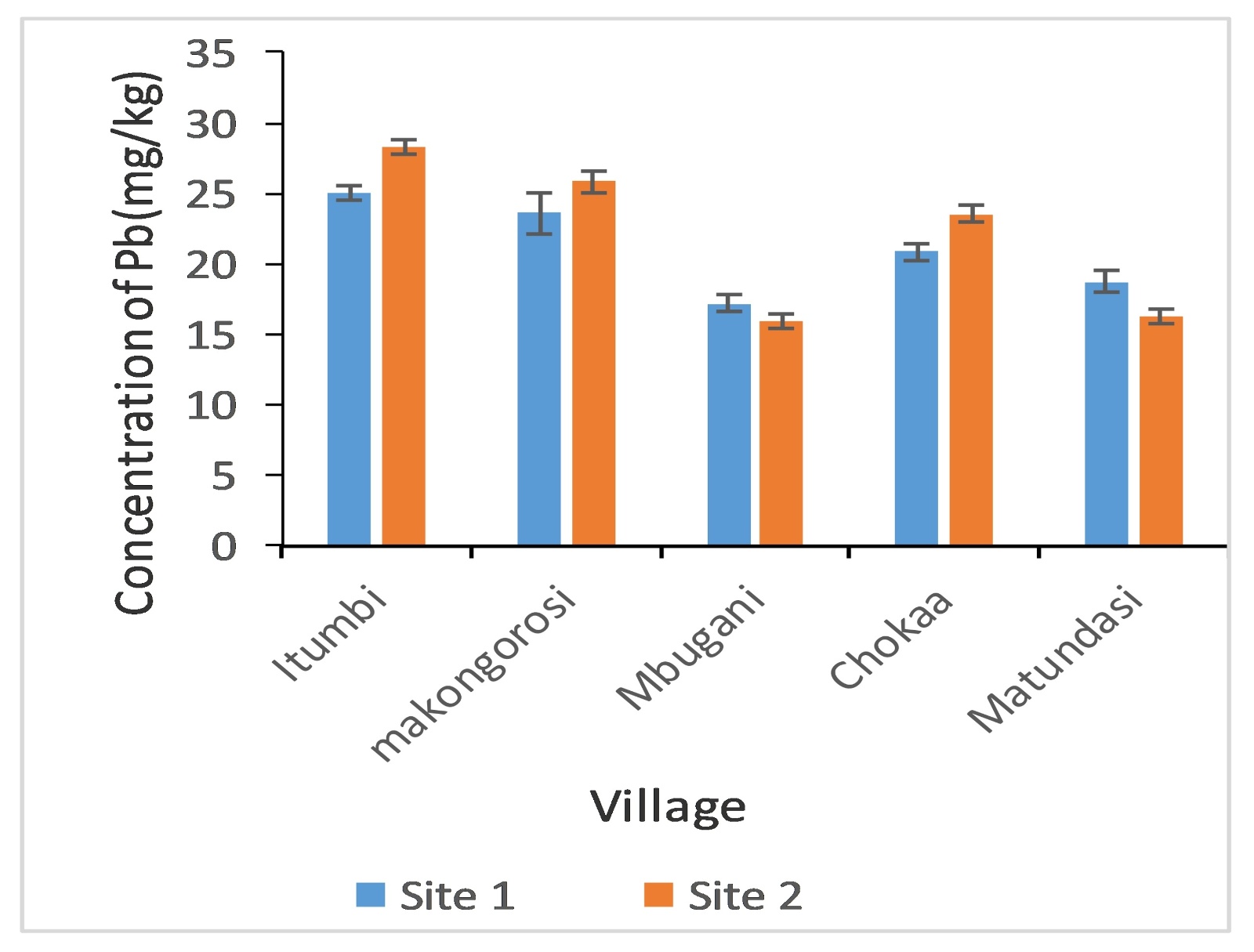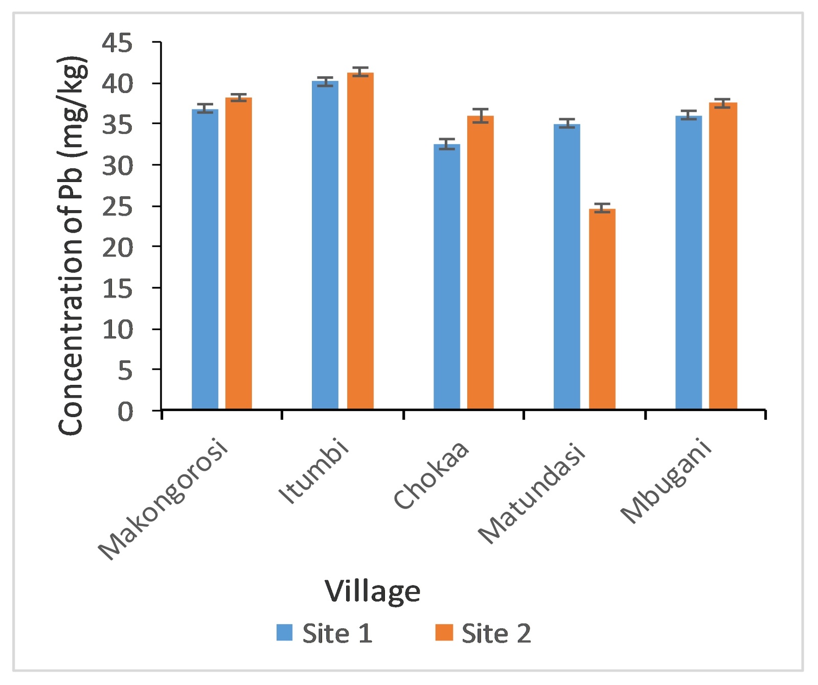 At the tailing deposit site (0 m), the concentration of Pb ranged from 24.66 mg/kg at Matundasi site 2 to 41.33 mg/kg at Itumbi village site 2. The results also show that for most sites, there was a small difference in the concentration of Pb (Figure 2).