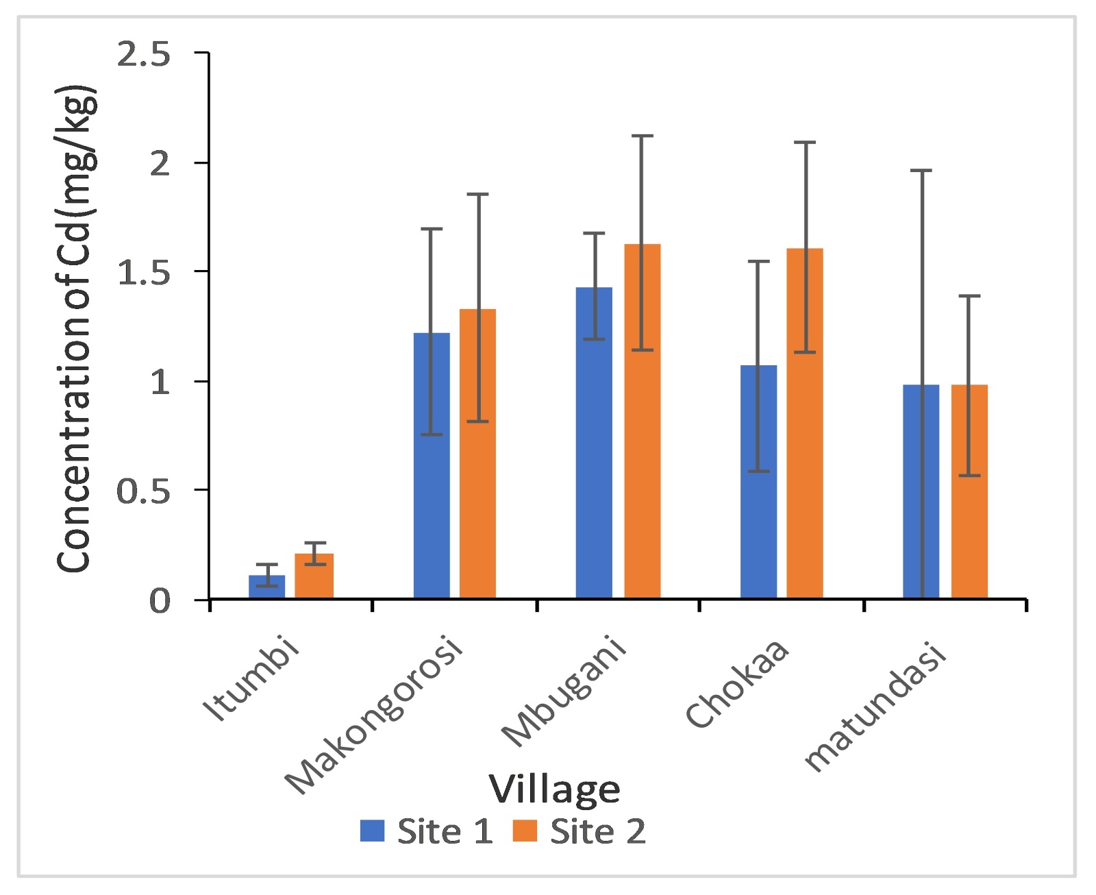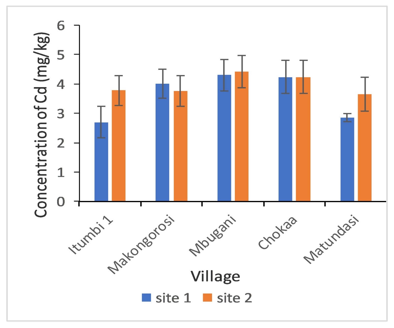 At 0 m (Figure 4), the concentration of Cd ranged from 2.7 to 4.42 mg/kg, where the lowest concentration was recorded in Itumbi village site 1, while the highest was recorded in Mbugani village site 2. However, a small difference was recorded (Graph 4) in the concentration of Cd for most of the studied sites.