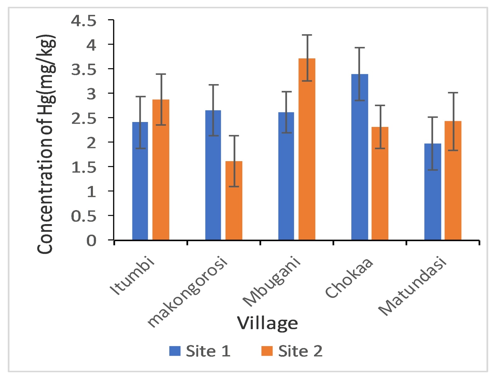 The results indicate that the lowest concentration of Hg at 0 m (Figure 6) was recorded at the Makongorosi site 2 (1.61 mg/kg), while the highest concentration was recorded at the Mbugani village site 2 (3.72 mg/kg) (Figure 6), the concentration of which was above the allowable limit. The results indicate a small range of Hg concentrations among the studied sites, with the lowest value recorded at Mbugani Village Site 1 (0.88 mg/kg) and the highest at Chokaa Village Site 2 (1 mg/kg) (Figure 7). The results show a significant decrease in Hg concentration from 0 m to 200 m for all sites.