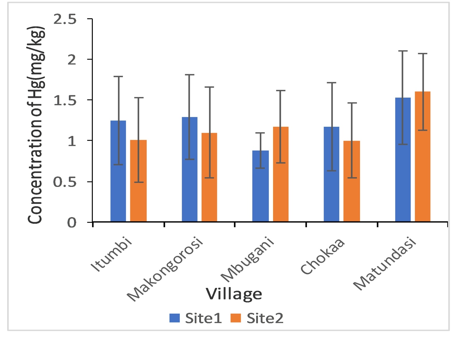 Figure 7. Concentration of Mercury (Hg) at 200 m from the tailings across different villages (Makongorosi, Itumbi, Chokaa, Matundasi, and Mbugani) for Site 1 and Site 2.