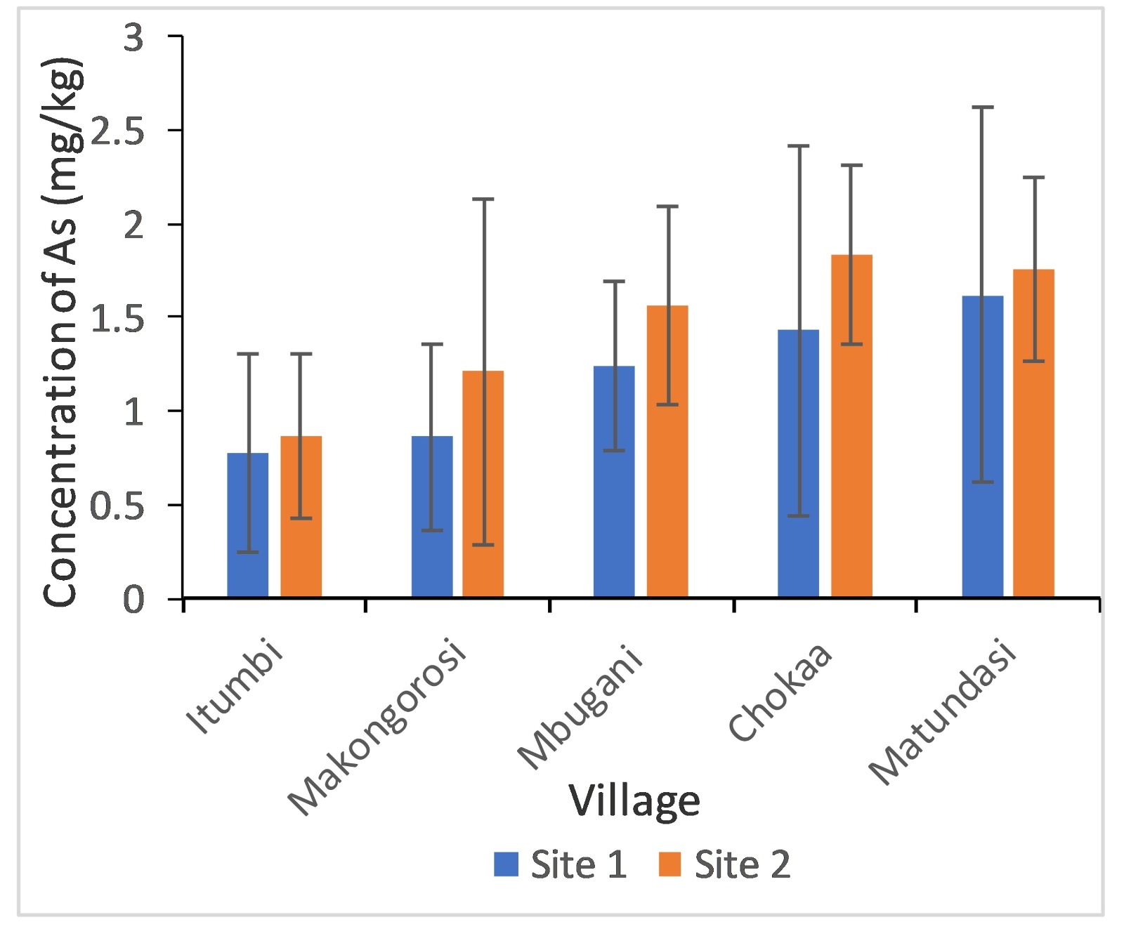Figure 8. Concentration of arsenic (As) at 0 m from the tailings across different villages (Makongorosi, Itumbi, Chokaa, Matundasi, and Mbugani) for Site 1 and Site 2.