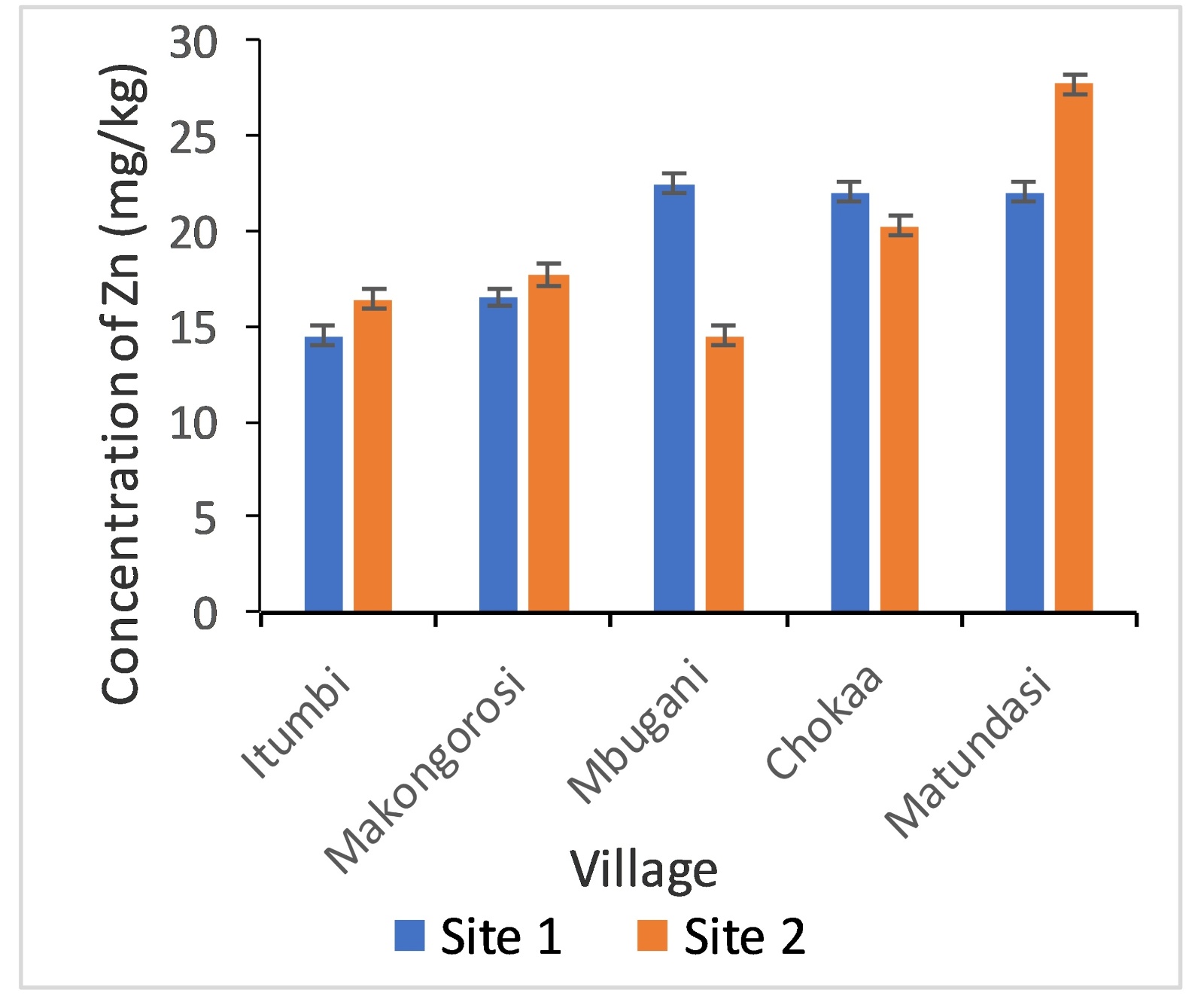 Figure 10. Concentration of Zinc (Zn) at 0 m from the tailings across different villages (Makongorosi, Itumbi, Chokaa, Matanda’s, and Mbugani) for Site 1 and Site 2.